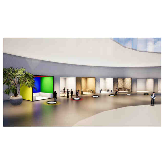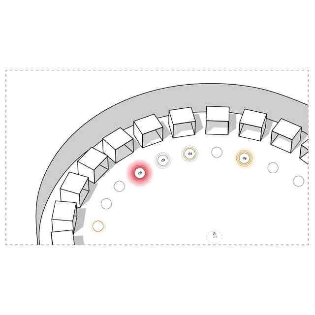 本願意匠に係る画像は、仮想空間上の展示会において展示ブースがサークル状にレイアウトされており、各展示ブースの前方に設けた円形部の状態表示で賑わいの度合いを可視化するための情報表示用画像である。前記円形部は、当該展示ブースへの訪問者が多ければ多いほど赤色に近い色味に変化する。また、前記円形部のうち中央にスピーカーアイコンが付された同心状の三重円からなるものについては、当該展示ブースに音声サービスを備えていて、訪問者に積極的に呼び込みを行い展示ブースへの訪問を誘うこともできるようになっている。画像図ではいわゆるバードビューによって展示会会場の一部をクローズアップして表示しているが、参考図で示すようにいわゆるストリートビューとすることもできる。