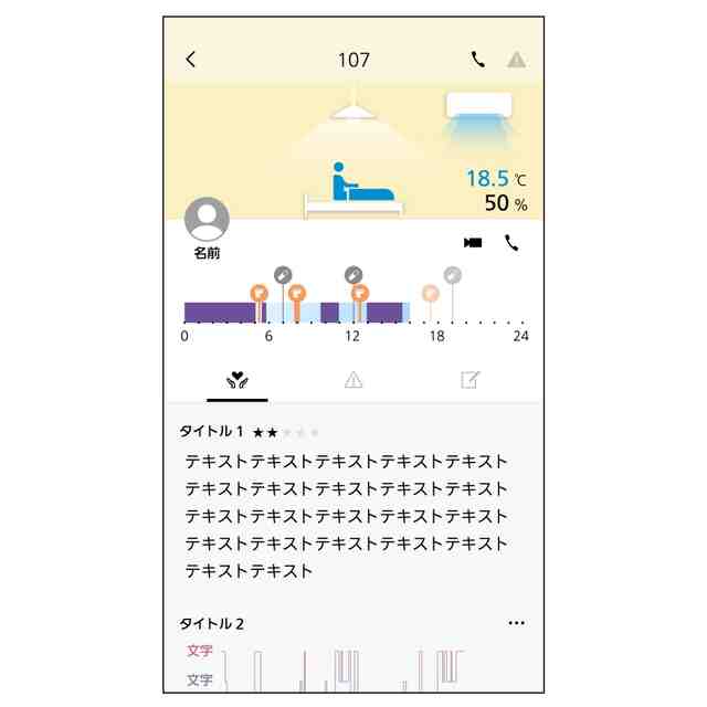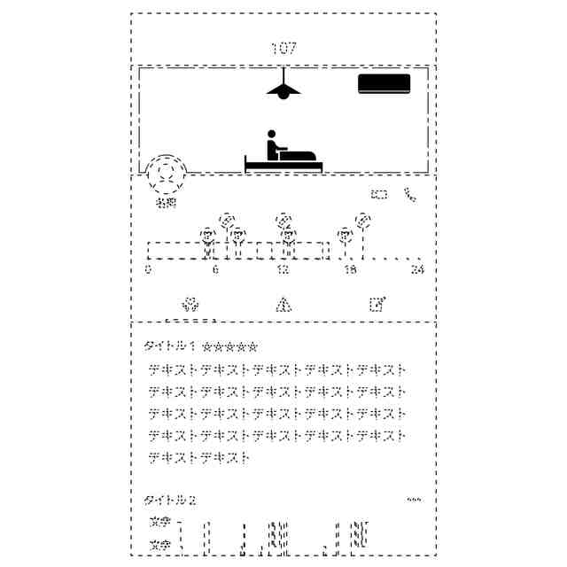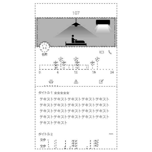 本画像は、例えばサービス付き高齢者向け住宅において、居室利用者の状態を確認することを目的とした情報表示用画像である。具体的には、居室内の照明や空調の稼働状況を検知し、居室利用者の状態を示すものである。本画像は「画像図」から「変化した状態を示す画像図」へ順および逆順に変化する。