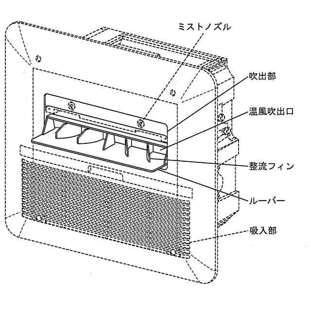 本物品は、主に浴室の天井などの壁面に取付けられ、温風を吹出して浴室内部の空気を温める暖房機能、浴室内の空気を乾燥状態にする機能を備えた装置である。この浴室暖房乾燥機は、[各部名称を示す参考斜視図]に示すように、温風の発生や浴室内の空気を回収する本体部、吹出部や吸入部などを有するパネル部を備える。本体部は浴室外部に配置され、パネル部が浴室内に露出するように配置される。パネル部には、温風吹出口やミストノズルなどを含む吹出部を備えるとともに、開閉可能なルーバーを備える。このルーバーは、浴室暖房乾燥機が運転状態のときに開状態となって浴室内に温風吹出口およびミストノズルを露出させ、運転停止状態のときに閉状態となって温風吹出口およびミストノズルの前面を覆う。またルーバー上には、温風吹出口に対して直進方向および拡開方向に向けて温風を整流する整流フィンを備える。