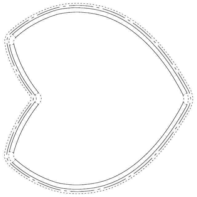実線であらわした部分が、意匠登録を受けようとする部分である。一点鎖線は意匠登録を受けようとする部分とその他の部分の境界のみを示す線である。斜視図、拡大図、端面図、断面図及び変形させた状態の拡大左側面図を含めて意匠登録を受けようとする部分を特定している。背面図は正面図と同一に、底面図は平面図と同一にあらわれる。