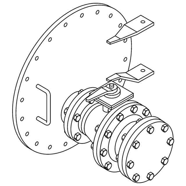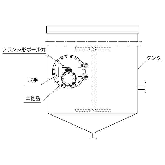 本物品は、タンク内部に堆積した鉱石スラリー等の残渣を除去するためのバキューム用マンホール蓋であって、その形状的特徴は使用状態を示す参考図、斜視図等に示すように、タンク側面下部のマンホール部に着脱する大径の円板からなる蓋体にノズルとバルブが接続され、タンク内のスラリーを全量払い出した後に、バルブを操作してタンク内部の残渣を吸引除去する方式となしたものである。
