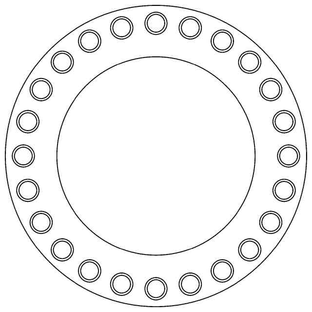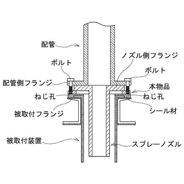 本物品は、洗浄塔などの被取付装置に配管を固定するとともに、溶液を突出するためのスプレーノズルを配管に取付固定するためのスプレーノズル固定用治具である。本物品を使用して、スプレーノズルを被取付装置と配管との間に取付固定する場合には、「使用状態を示す参考断面図1」および「使用状態を示す参考断面図2」に示すように、本物品と、管の配管側フランジとの間にスプレーノズルのノズル側フランジを挟持した状態で、配管側フランジに備えられた通孔を挿通したボルトを、本物品のねじ孔に螺合する。また、本物品のねじ軸を被取付装置の被取付フランジに備えられた通孔に挿通し、該ねじ軸にナットを螺合しさらに締め付ける。なお、本物品と被取付フランジとの間にシール材を挟持することにより、被取付フランジへの酸性溶液の付着を防止することもできる。