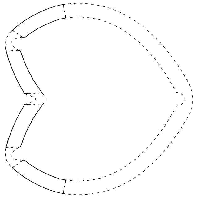 実線であらわした部分が、意匠登録を受けようとする部分である。一点鎖線は意匠登録を受けようとする部分とその他の部分の境界のみを示す線である。斜視図、端面図及び変形させた状態の左側面図を含めて意匠登録を受けようとする部分を特定している。底面図は平面図と対称に、右側面図は左側面図と対称にあらわれる。
