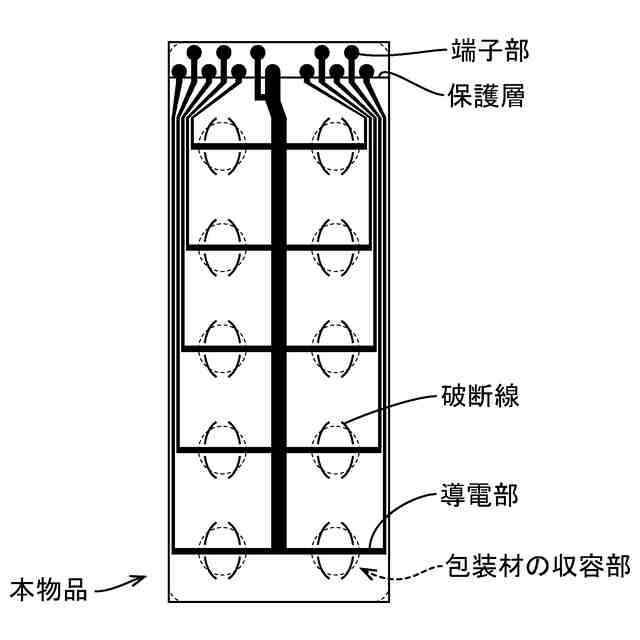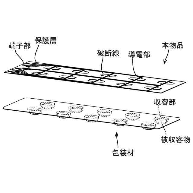 本物品は、例えば錠剤を収容する収容部を備える包装材に貼り付けられ、収容部の開封を検知するための開封検知シートである。本物品は、正面に設けられた導電部と、正面から背面までを貫通する破断線とを備える。使用に際しては、使用状態を示す参考斜視図に表わされるように、本物品の背面を包装材に対して貼り付ける。貼り付け後、本物品の導電部の一部は、使用状態を示す参考平面図に表わされるように包装材の収容部上を通るようになる。被収容物が包装材から押し出される際、本物品は破断線によって容易に突き破られ、導電部が破断される。導電部が破断されることで、外部の開封検知器等によって収容部の開封を検知可能となる。また、使用状態を示す参考斜視図および参考正面図に表わされるように、本物品の正面には、導電部の端子部以外の表面を覆うように透明または半透明の保護層が設けられていてもよい。
