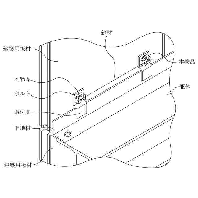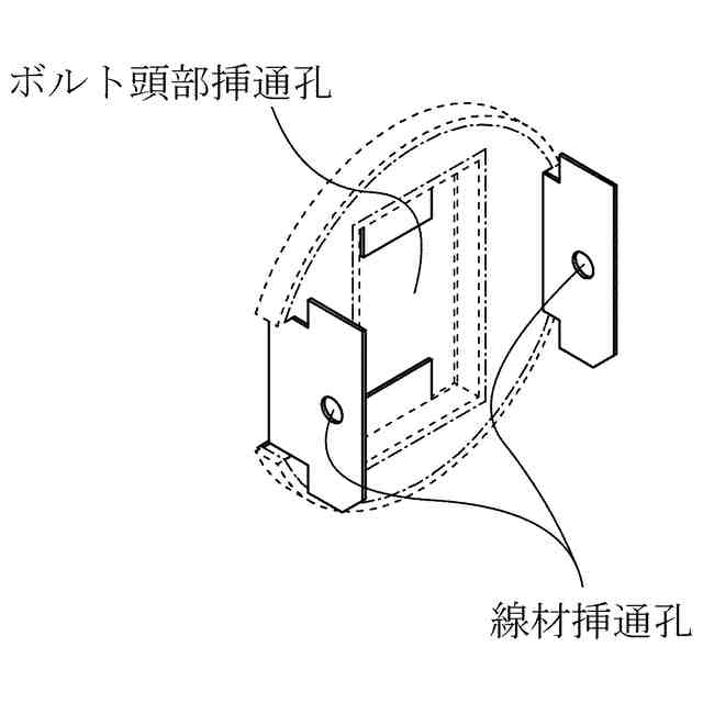 本物品は、使用状態を示す参考図に示すように、建築用板材を建物の躯体に係止するために用いる取付具と建築用板材とを締結するボルトの緩みを防止するために用いることができる。本物品を使用するときは、ボルト頭部挿通孔にボルトの頭部を挿通して、本物品をボルトに取り付ける。そして、隣り合って位置する2つの本物品に針金、鉄筋等の線材を架け渡して、これら2つの本物品を連結する。線材を架け渡すときは、一方の本物品の線材挿通孔に線材の一端を通し、他方の本物品の線材挿通孔に線材の他端を通す。