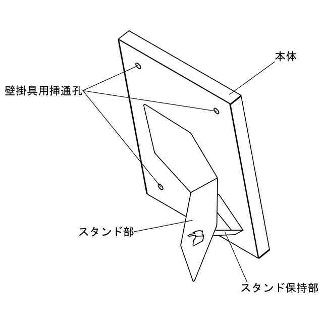 本物品は、例えばTシャツ等の布製品の額装に用いることができるものである。使用状態を示す参考図1及び2に示すように、本物品のスタンド部は縦置き状態及び横置き状態で本体を支持することができる。スタンド部を使用する時は、スタンド部及びスタンド保持部を起こして係合させる。