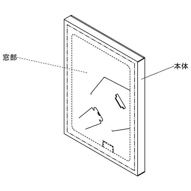 参考図を除く各図において実線で表わした部分、すなわち、正面の窓部及び窓部の周辺部、背面の壁掛具用挿通孔、並びに蓋固定爪が形成されている部分を除く部分が意匠登録を受けようとする部分である。一点鎖線は意匠登録を受けようとする部分とその他の部分との境界のみを示す線である。