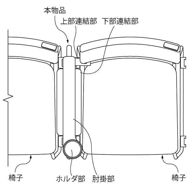 本物品は、左右両側に配置された椅子の下側が連結可能な下部連結部と、左側に配置された椅子の上側が連結可能な上部連結部と、を有し、少なくとも椅子の右側に肘掛部と、カップ等を収容するホルダ部と、を設けるカップホルダである。
