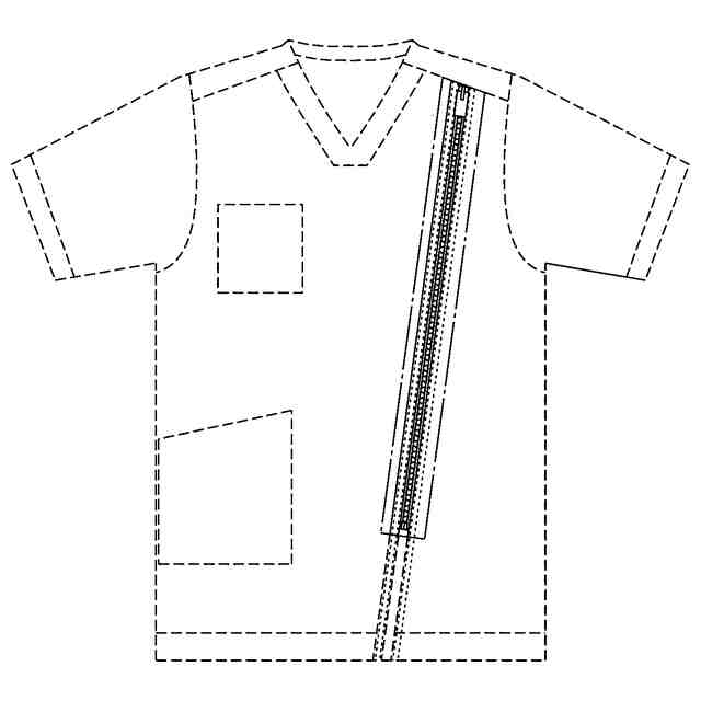 実線で表した部分が、部分意匠として意匠登録を受けようとする部分である。一点鎖線は、部分意匠として意匠登録を受けようとする部分とその他の部分との境界のみを示す線である。一点鎖線で囲まれた領域に含まれる点線は、ステッチ(縫い目)を示す。
