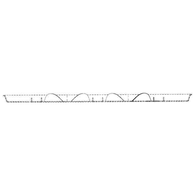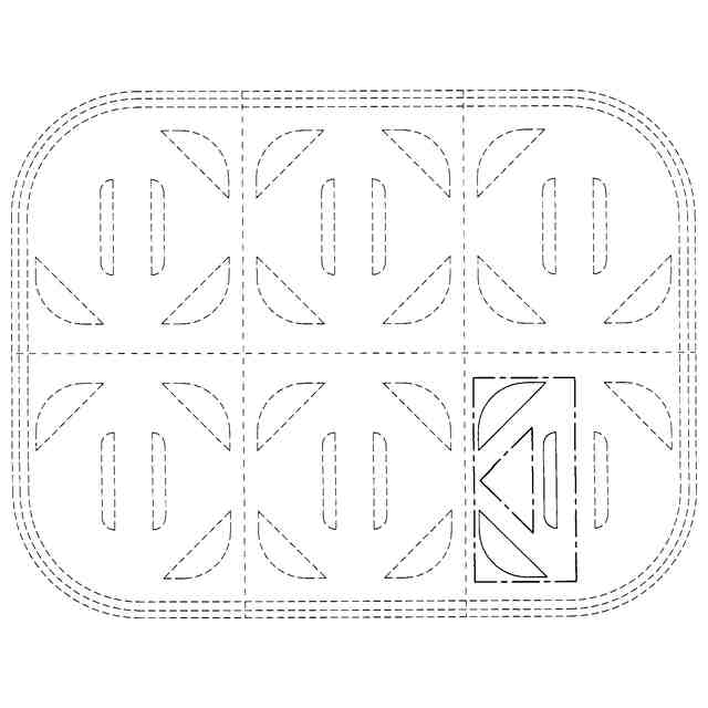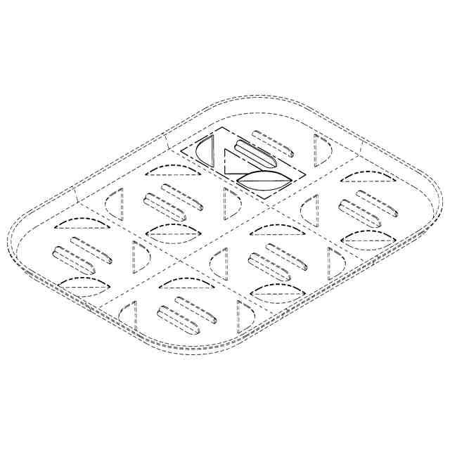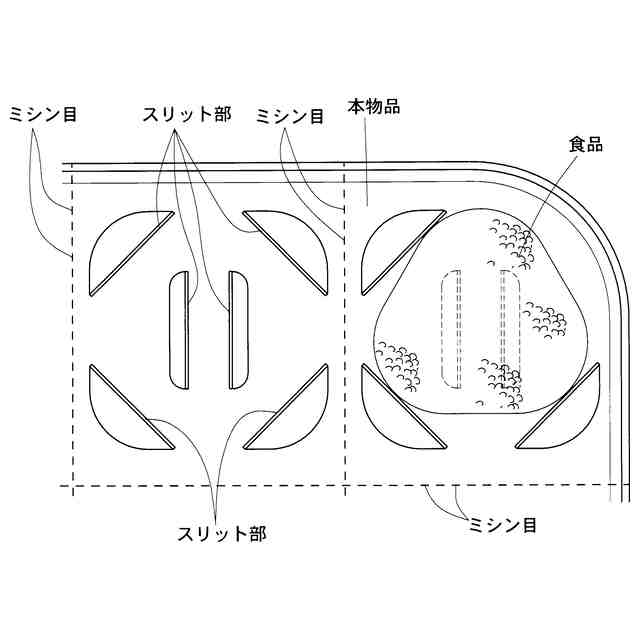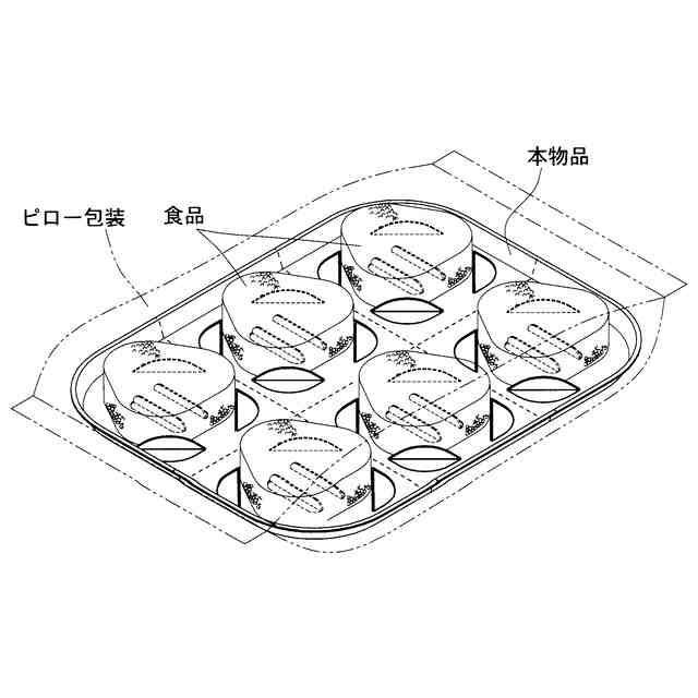 本物品は、使用状態を示す参考図1に示すように、収納対象物(参考図1では固形の食品)を外装のピロー包装内に収納する際に使用するトレーである。本物品は、一枚の板紙ブランクに複数のスリットを形成する等により得られる。使用状態を示す参考図2に示すように、そのスリット部を食品の形状に合わせて当接させることで、包装体内での食品の位置ずれを抑制するとともに電子レンジ等の加熱により食品の下面から生じる蒸気が抜けやすくなる。