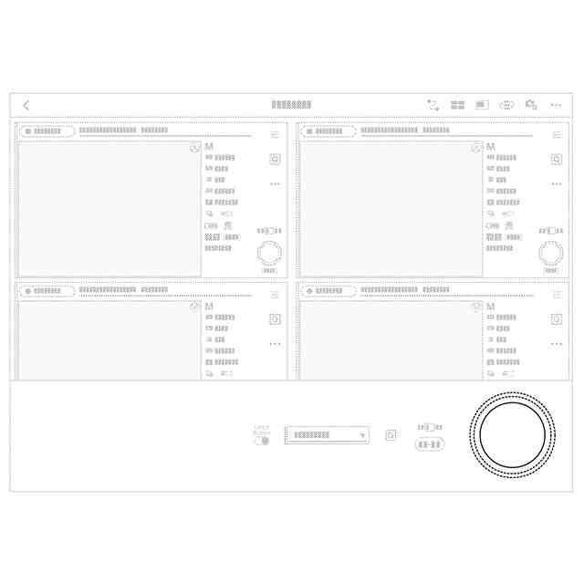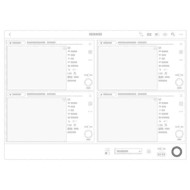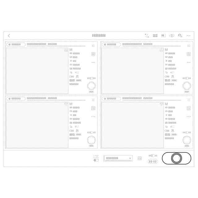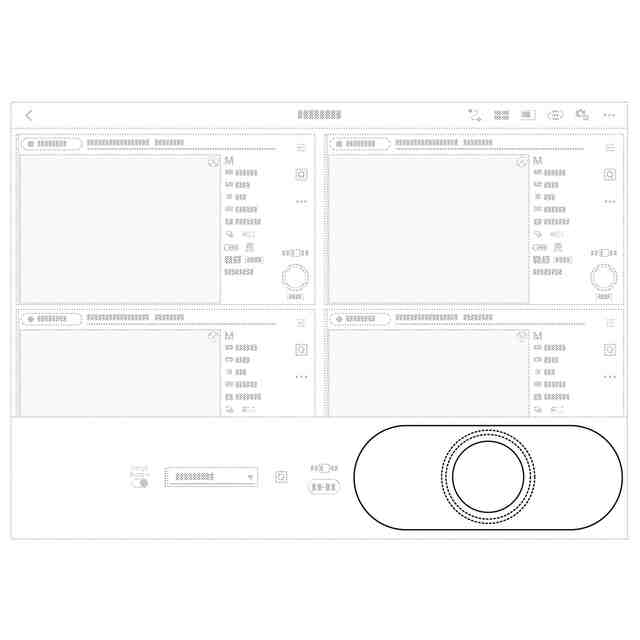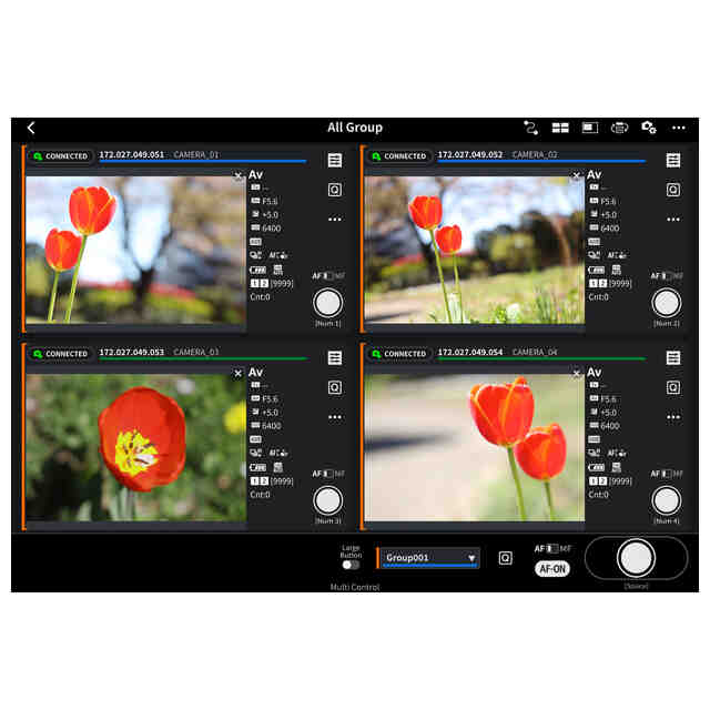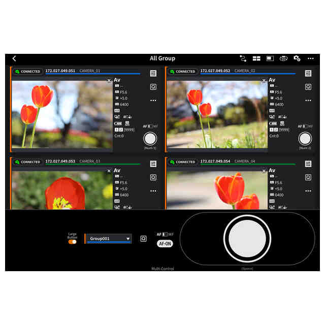 本画像は、タッチパネルディスプレイを搭載した情報処理端末(スマートフォンやタブレットPC等)から複数のカメラを遠隔操作するために表示される。ユーザは本画像の右下に配置された円形の撮影指示ボタンへのタッチ操作により、複数のカメラに対して一括して撮影開始または撮影終了を指示する。「画像図」及び「変化状態の画像図1」、または、「変化状態の画像図2」及び「変化状態の画像図3」に示す通り、本画像の撮影指示ボタンは大小を切り替えることが可能である。「変化状態の画像図2」及び「変化状態の画像図3」には、撮影指示ボタンの周囲に角丸矩形の領域を設けた状態が示される。「変化状態の画像図2」及び「変化状態の画像図3」が表示されている場合は、角丸矩形領域内で検知されたタッチ操作が、撮影指示ボタンへの操作として情報処理端末に認識される。