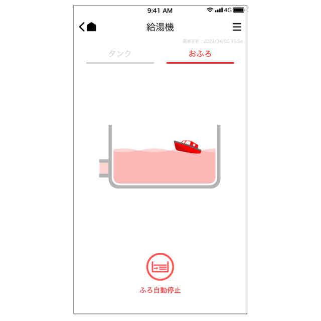 本画像は、給湯器のふろ自動機能を開始もしくは停止する操作を行うためのアイコン用画像である。具体的には、画像図の状態で表示される場合、ふろ自動機能は停止中であり、本画像を操作することでふろ自動機能が開始される。一方、変化した状態を示す画像図の状態で表示される場合、ふろ自動機能は稼働中であり、本画像を操作することでふろ自動機能は停止される。