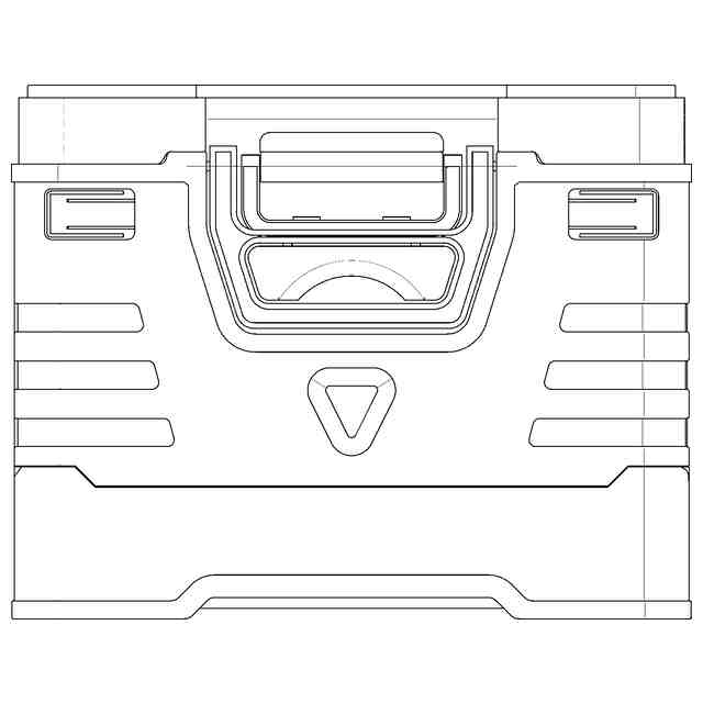 。斜視図及び平面図に置いて、直角の格子状の部分はソーラーパネル部である。ソーラーパネル面は、本体から取り外すことが可能であり、裏返して取り付けする事が可能である。正面図にある蓋は開閉可能なものである。左側面図は右側面図と同一につき、左側面図を省略する。