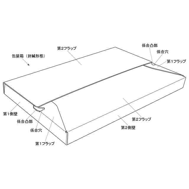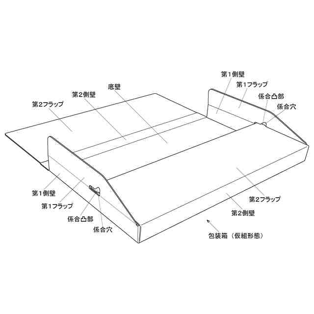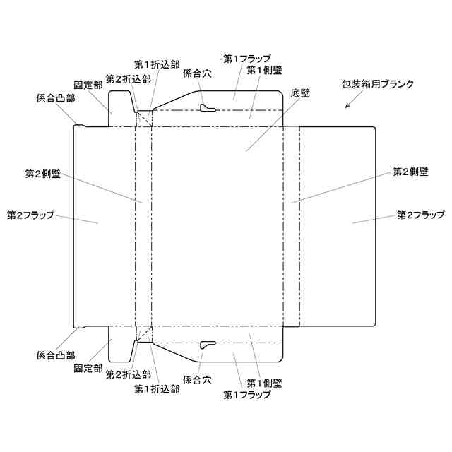 本物品は、段ボール等の厚紙から成る包装箱用ブランクである。「各部の名称を示す参考図」に示すように、包装箱用ブランクは、底壁と、一対の第1側壁と、一対の第1フラップと、一対の第2側壁と、一対の第2フラップと、を備えている。各第1フラップには、第1側壁との境界に沿って係合穴が形成されている。一方の第2フラップの両端には、一対の係合凸部が突出している。一方の第2フラップ側となる底壁の2つの角の近傍には、それぞれ、第1折込部と第2折込部とが配置されている。各第1折込部は第1側壁の端部に連設され、各第2折込部は第2側壁の端部に連設されている。各第1折込部と各第2折込部とは、略直角三角形状に形成され、斜辺同士で連設されている。一方の第2フラップの端部と各第2折込部とには、固定部43が連設されている。「使用状態を示す参考斜視図(1)」に示すように、包装箱用ブランクは、各第1側壁、各第2折込部及び各固定部を内側に折り返し、各固定部を一方の第2フラップに接着することで、折畳形態とされた包装箱になる。「使用状態を示す参考斜視図(2)」に示すように、各第1側壁と各第1フラップとが引き起こされると、各第1折込部と各第2折込部とが内側に折り込まれ、各固定部及び一方の第2フラップが引っ張られ、一方の第2側壁が上方に折り曲げられる。一方の第2側壁を略直立させながら一方の第2フラップを一対の第1フラップの間に進入させるように折り曲げると、各係合凸部が第1フラップの裏側から係合穴に差し込まれ、包装箱が折畳形態から仮組形態になる。仮組形態の包装箱に物品を収容した後、「使用状態を示す参考斜視図(3)」に示すように、一対の第1フラップが内側に折り曲げられ、他方の第2側壁を略直立させながら他方の第2フラップを折り曲げることで、包装箱が仮組形態から封緘形態になる。