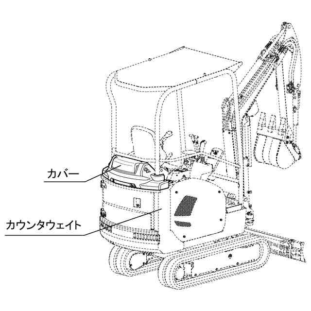 本物品は、電動モータを動力源とした油圧ショベルであり、車体後部に充電器を覆うカバーを備えたものである。カバーは、カウンタウエイトの上部に設けられている。