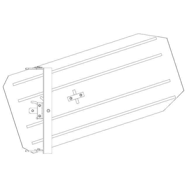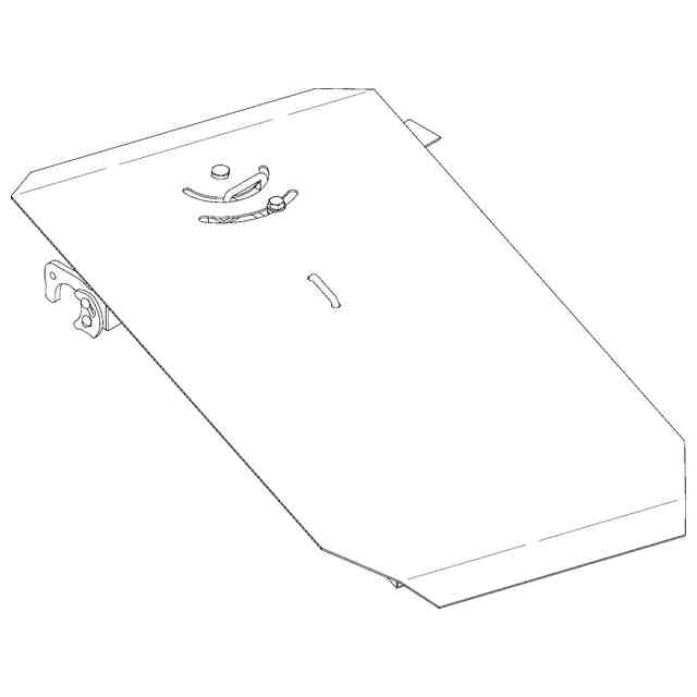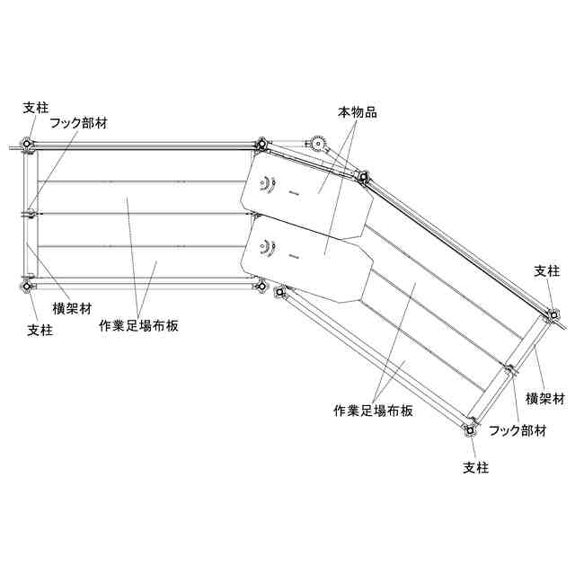 本物品は、例えば、仮設足場を上から見た図である使用状態を示す参考図に示されているように、仮設足場に設けられる屈曲部に配置される床材である。仮設足場は、多数の支柱と、2本の支柱の間に架設される横架材と、2本の横架材に両端のフック部材が係止されることにより架け渡される作業足場布板と、を含んで構築され、複数の作業足場布板が、これらの作業足場布板の長さ方向に並設されることにより、作業者が歩行等するための通路が形成され、この通路の途中には、長さ向に隣接する作業足場布板同士が角度をなすことにより、前述の屈曲部が設けられるとともに、これらの作業足場布板の間にすき間が設けられ、このすき間を覆うために本物品が用いられる。各部の名称を示す参考斜視図に示されているように、本物品の大きな面積を有する本体は金属板製であって、この本体における前述の通路の延び方向の両端部には、下り傾斜した傾斜部が設けられ、これらの傾斜部により、作業足場布板と本物品との間での作業者等の行き来が容易になり、また、本体の裏面には、各部の名称を示す参考底面図に示されているように、本体を補強するための複数の長寸の棒状部材が取り付けられている。また、本体の裏側には、この本体を貫通するピンによる中心軸に結合されていて、この中心軸から延びている板状の連結部材と、この連結部材の端部に結合されている細長部材とが配置され、このアングル材で形成されていて、中心軸を中心に回転自在となっているこの細長部材の両端部にフック部材が取り付けられている。これらのフック部材が、前述のすき間の箇所に配置されている前述の横架材に上から係止されて、それぞれのフック部材の側部に遊動可能に設けられているロック部材が、フック部材の開口部の一部を閉鎖するように遊動することにより、フック部材の開口部からの横架材の抜け出しが防止されて、本物品が横架材に取り付けられる。各部の名称を示す参考斜視図に示されているように、本物品には、作業者が本物品を持ち上げる等のときに用いる逆U字状の摘み部材が2個設けられ、これらの摘み部材のうち、各部の名称を示す参考底面図に示されているように、本体の裏面に設けられた短寸の棒状部材の位置に配置されている一方の摘み部材は、本体に設けられた孔に対して単に上下動自在に配置されているが、他方の摘み部材は、前述の中心軸を中心に回転自在となっている細長部材に結合された取付部材に上下動自在に取り付けられているため、上下動自在かつ中心軸を中心に回転自在となって本体に配置されている。このため、前述の他方の摘み部材の回転のために、本体には、中心軸を中心とする円弧状の第1長孔が形成され、この第1長孔から前述の他方の摘み部材の上部が、各部の名称を示す参考斜視図に示されているように、本体の上面から突出している。また、本体には、中心軸を中心とする円弧状の第2長孔も形成され、この第2長孔には、ボルトの頭部が第2長孔に係止してこのボルトの軸部が挿通され、この軸部の下端は、各部の名称を示す参考底面図に示されているように、ナットにより細長部材に結合されている。このため、両端部に前述のフック部材が設けられている細長部材は、第2長孔に係止しているボルトの頭部がこの第2長孔に沿って回転することにより、中心軸を中心に回転自在となっており、これにより、各所に構築される仮設足場にいろいろな角度で設けられる前述の屈曲部の角度に本物品を対応させることができることになる。