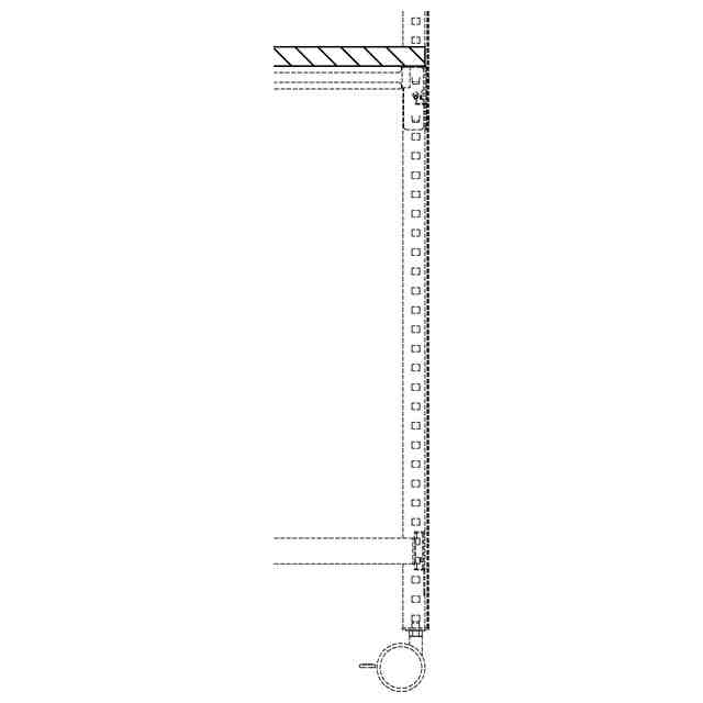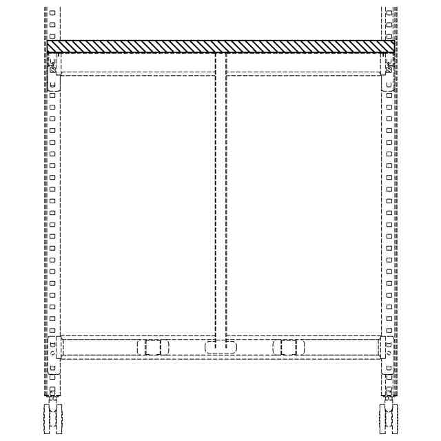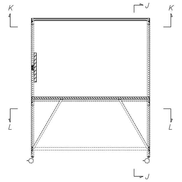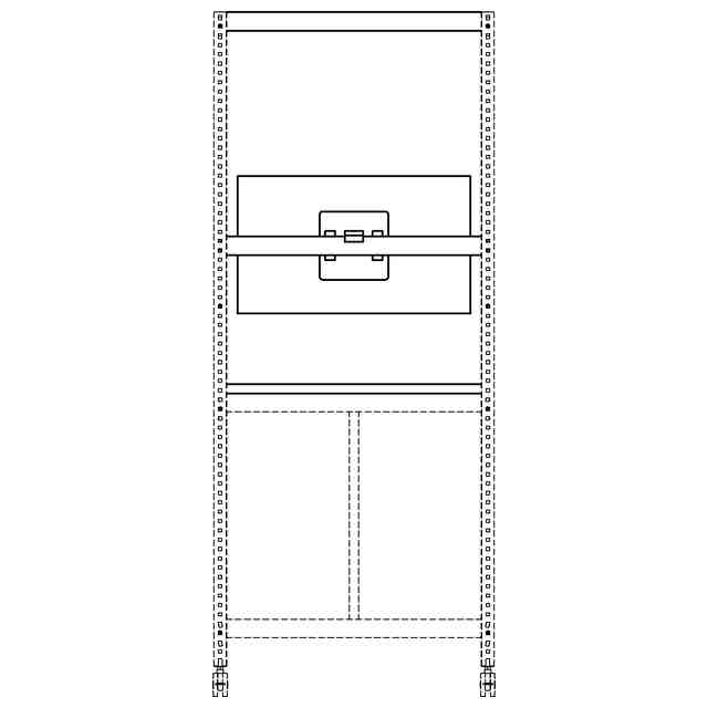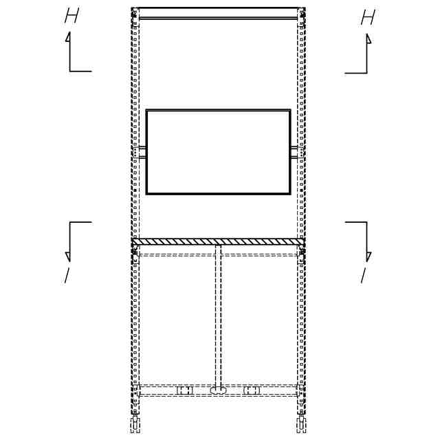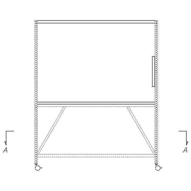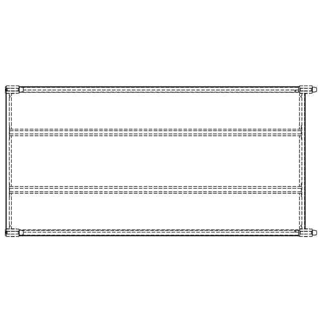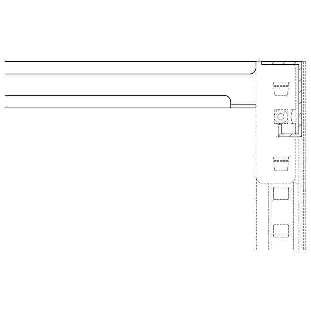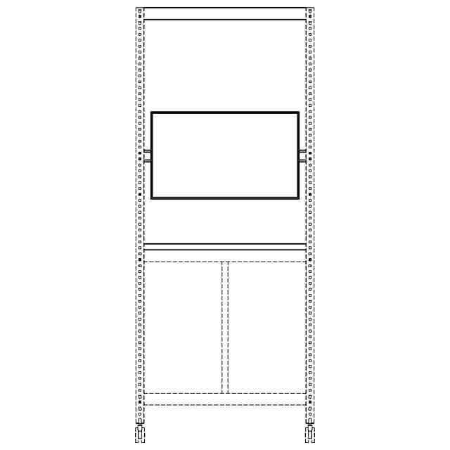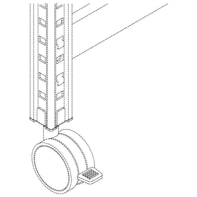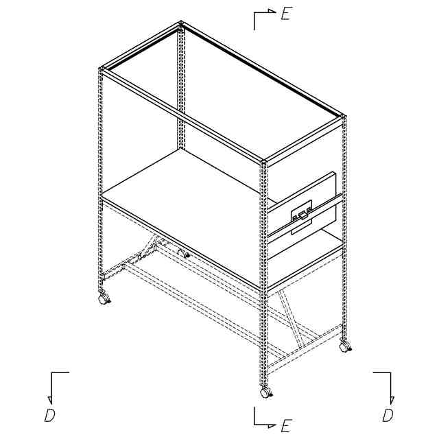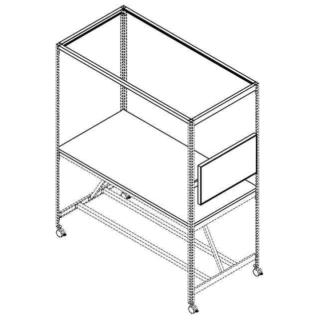 本物品は、四方に断面略L字状の支柱を備えたものである。支柱には上下方向に天板や連結部材を係止する為の複数の穴を備えており、係止位置を高さ方向において変更可能としたものである。正面視右側のフレームにモニターを吊支備えたものである。モニターを右側面外側に取り付けた状態を示す斜視図の様に、モニターは天板上方である内側にも、四方支柱の外側にも吊支可能なものである。