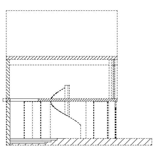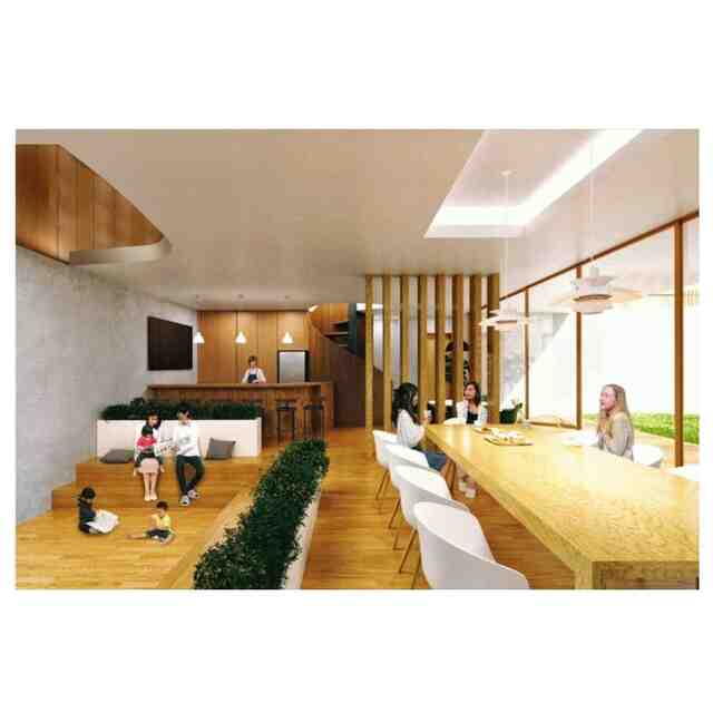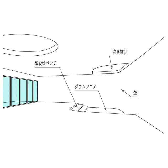 この建築物は、共同住宅である。図面に表した意匠は、共同住宅における共用スペースに係る部分である。曲面状の壁と階段状ベンチで囲われたダウンフロアが、落ち着いたくつろぎ空間となっている。ダウンフロアの上部は吹き抜けていることにより、落ち着いた中にも縦方向への広がりを感じさせるものとなっている。