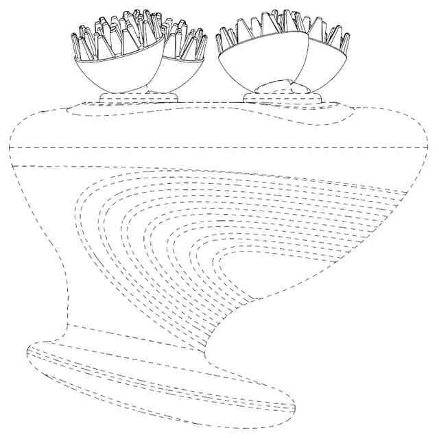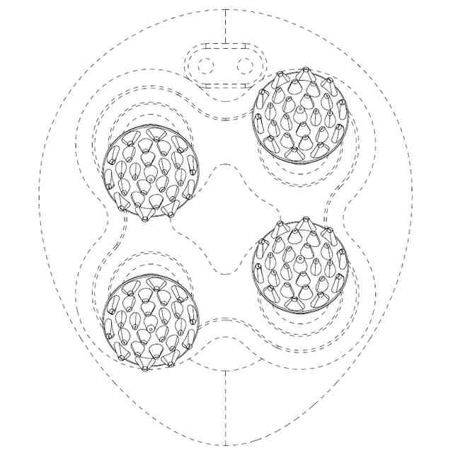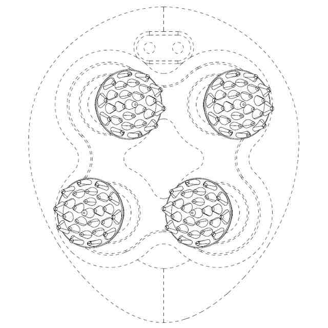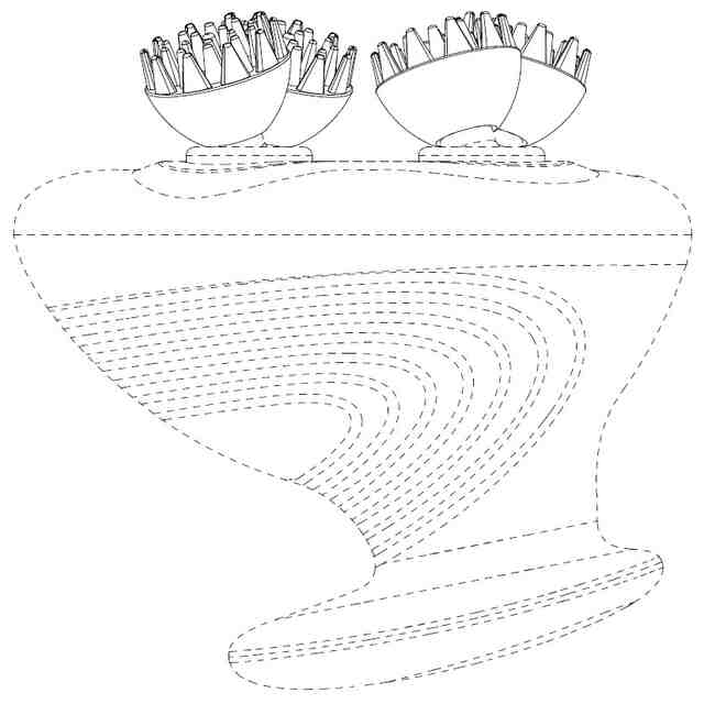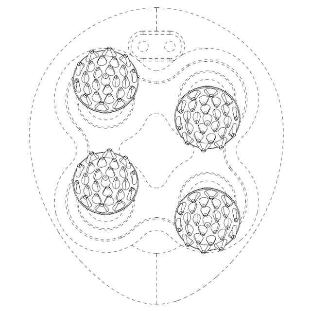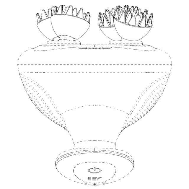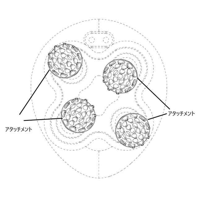 実線で表した部分が意匠登録を受けようとする部分である。本物品の4つの各々のアタッチメント部の位置は、通電すると、平面図から、変化後を示す平面図1、変化後を示す平面図2、変化後を示す平面図3、変化後を示す平面図4に表される順に各々回転するように移動し、変化後を示す平面図4からは、繰り返し、平面図、変化後を示す平面図1、変化後を示す平面図2、変化後を示す平面図3、変化後を示す平面図4を表される順に繰り返し回転するように移動し、通電を停止すると、平面図に表される位置にこれらのアタッチメント部は戻る。
