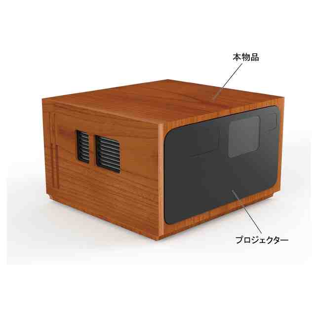 本物品は、プロジェクターを収納可能なプロジェクター用ケースである。使用状態を示す参考図は、木製の本物品にプロジェクターを収納した状態を示す。