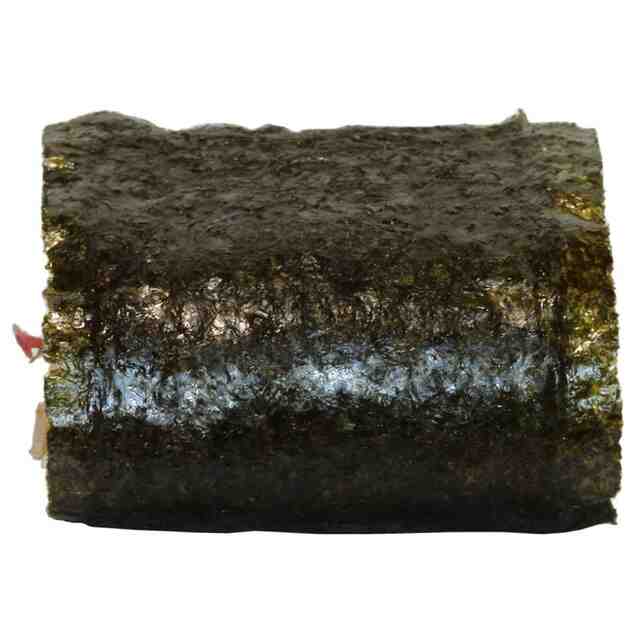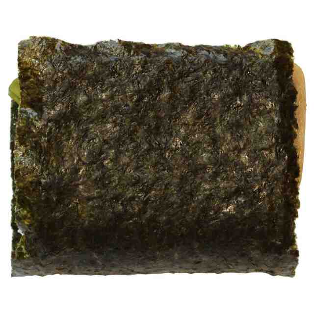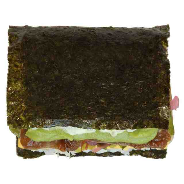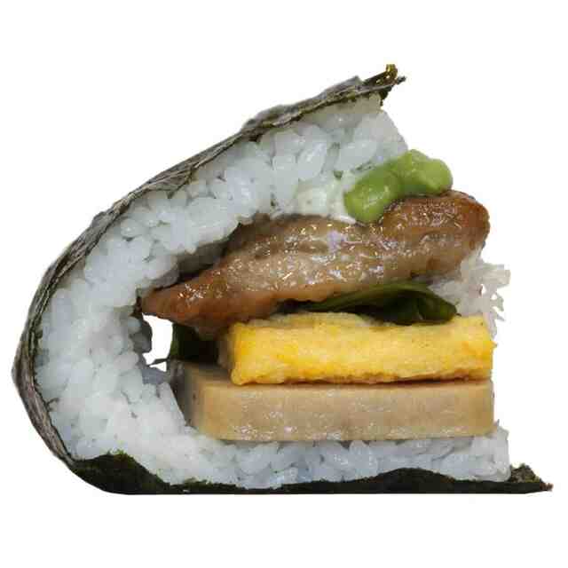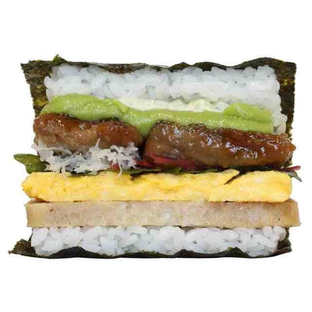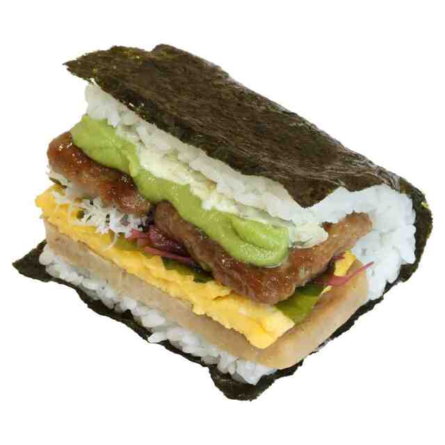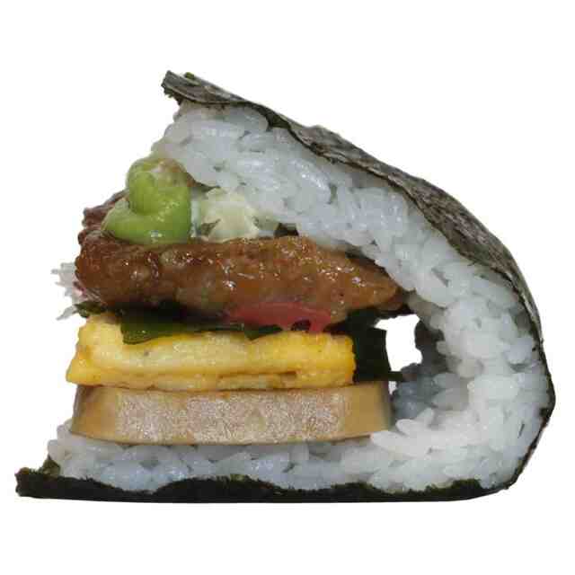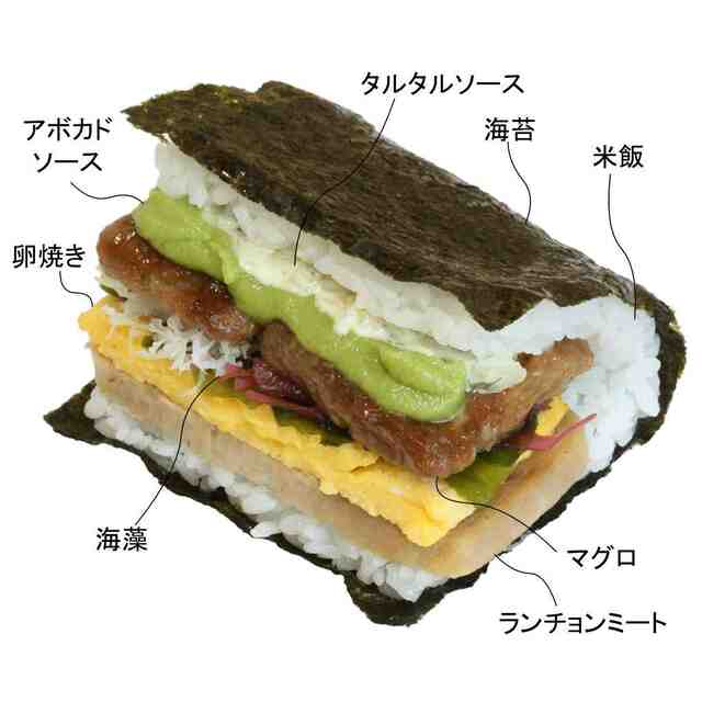 本物品は、2つ折りした扁平状の海苔付き米飯の間に、複数の具材を挟み込んだおにぎりである。各部の名称を示す参考図のように、上下の米飯の間の各具材はそれぞれ、タルタルソース、アボカドソース、マグロ、海藻、卵焼き、ランチョンミート、である。本物品は、斜視図、正面図、右側面図及び左側面図に示すように各具材の全てが、斜め上側、正面側及び左右側面から視認できる。