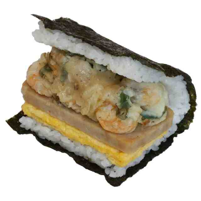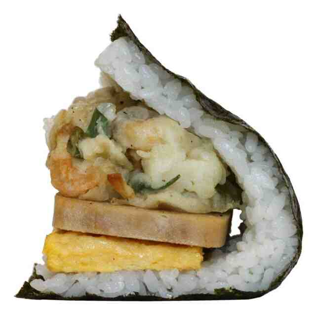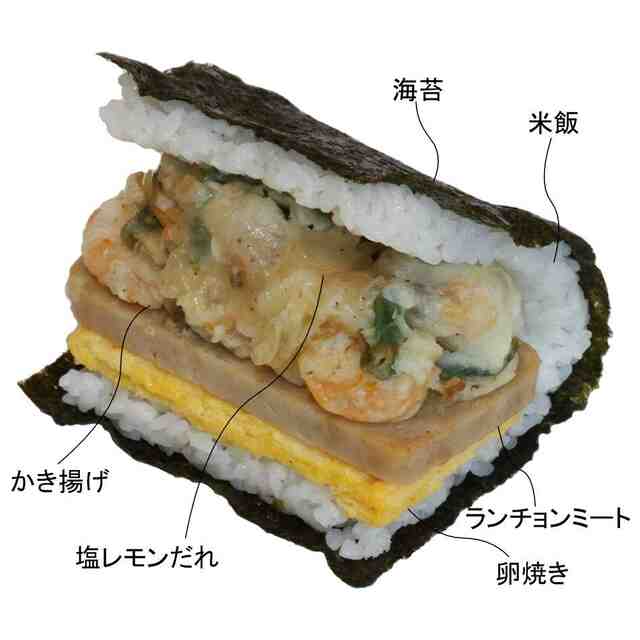 本物品は、2つ折りした扁平状の海苔付き米飯の間に、複数の具材を挟み込んだおにぎりである。各部の名称を示す参考図のように、上下の米飯の間の各具材はそれぞれ、塩レモンだれ、かき揚げ、ランチョンミート、卵焼き、である。本物品は、斜視図、正面図、右側面図及び左側面図に示すように各具材の全てが、斜め上側、正面側及び左右側面から視認できる。
