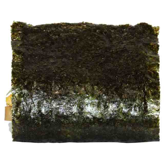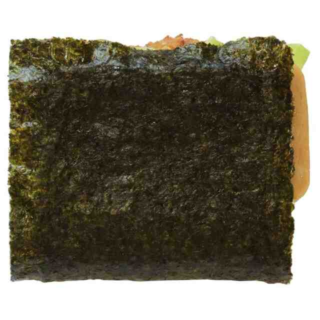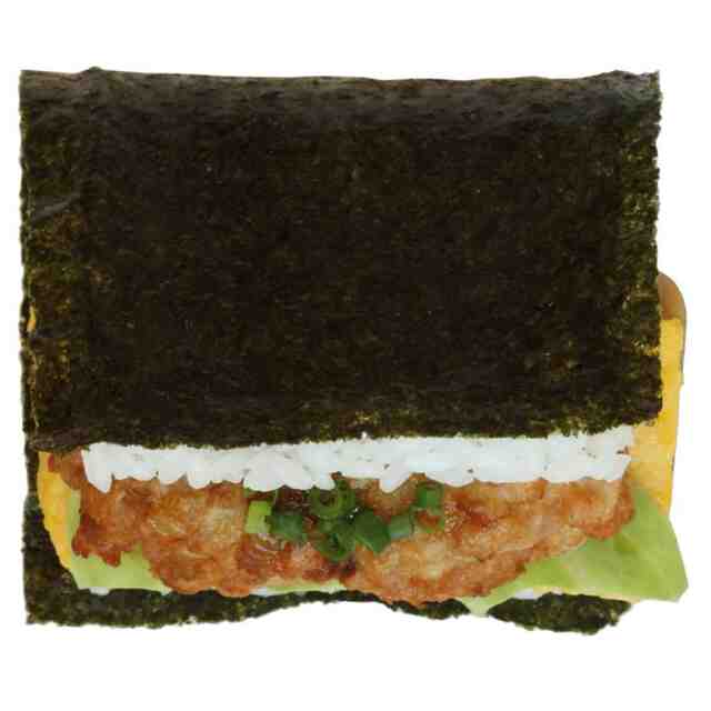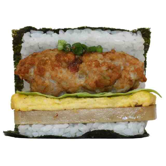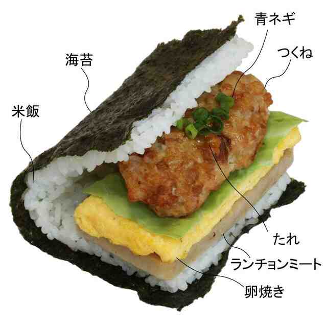 本物品は、2つ折りした扁平状の海苔付き米飯の間に、複数の具材を挟み込んだおにぎりである。各部の名称を示す参考図のように、上下の米飯の間の各具材はそれぞれ、青ネギ、たれ、つくね、卵焼き、ランチョンミート、である。本物品は、斜視図、正面図、右側面図及び左側面図に示すように各具材の全てが、斜め上側、正面側及び左右側面から視認できる。