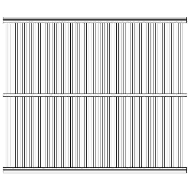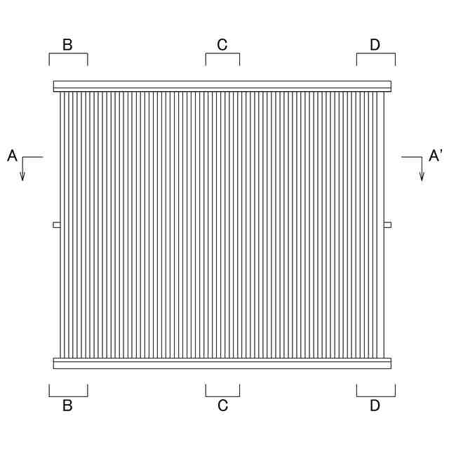 B部分におけるA-A’線断面拡大図は、正面図のB部分におけるA-A’線断面拡大図である。C部分におけるA-A’線断面拡大図は、正面図のC部分におけるA-A’線断面拡大図である。D部分におけるA-A’線断面拡大図は、正面図のD部分におけるA-A’線断面拡大図である。使用状態を示す参考図1は、本願意匠のフェンスを正面右斜め上方から見た斜視図である。使用状態を示す参考図2は、本願意匠のフェンスを3連で設置した状態を正面右斜め上方から見た参考図である。