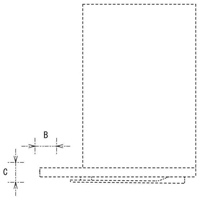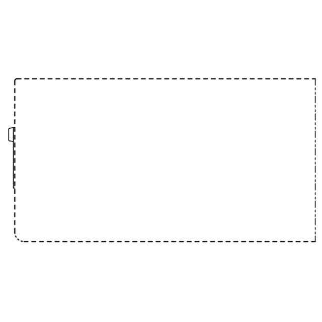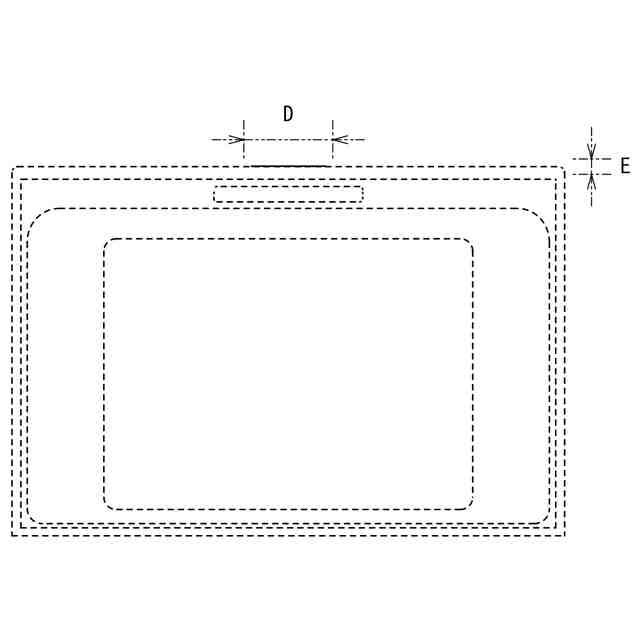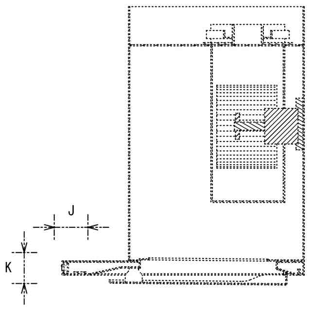 左側面図は、右側面図と対称にあらわれるため省略する。実線で表された部分が部分意匠として意匠登録を受けようとする部分であり、「内部構造を省略したA-A´線断面図」、「B-C間部分拡大図」、「D-E間部分拡大図」、「F-G間部分拡大図」、「H-I間部分拡大図」、「J-K間部分拡大図」、「意匠登録を受けようとする部分の拡大正面図」を含めて意匠登録を受けようとする部分を特定している。「B-C間部分拡大図」、「D-E間部分拡大図」、「F-G間部分拡大図」、「H-I間部分拡大図」、「J-K間部分拡大図」における二点鎖線は、指示線によって区切られた拡大箇所の周縁のみを示す線である。