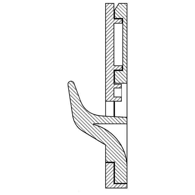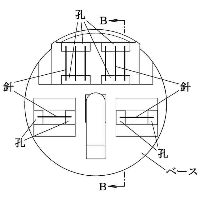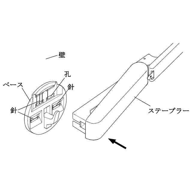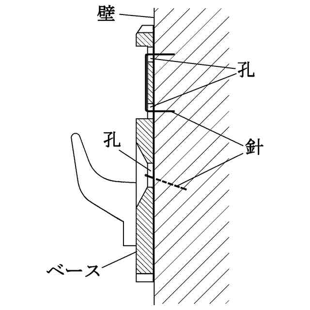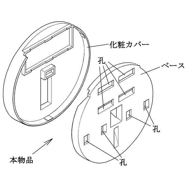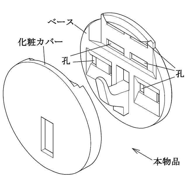 本物品は、石膏ボード等の壁に取り付けて使用する、時計,額縁等の物品吊り下げ用フックであり、「参考分解斜視図1」及び「参考分解斜視図2」に示すように、ベースと化粧カバーに分離でき、「取付方法を示す参考斜視図」,「取付方法を示す参考正面図」及び「取付方法を示す参考B-B断面図」に示すように、ベースを壁に当てながら、ステープラーでコ字形の針(ステープル)をベースの孔と孔の間を跨ぐように打ち込むことでベースを壁に固定し、その後、化粧カバーを装着して孔や針を隠し、美観を向上させた。尚、本物品は、合成樹脂製であり、幅約43mm,高さ約43mm,奥行き約14mm(突起部含む)である。
