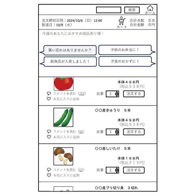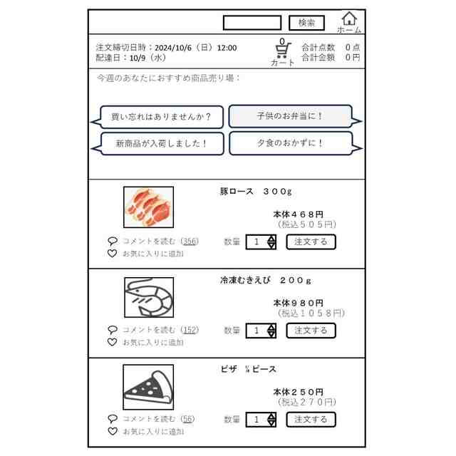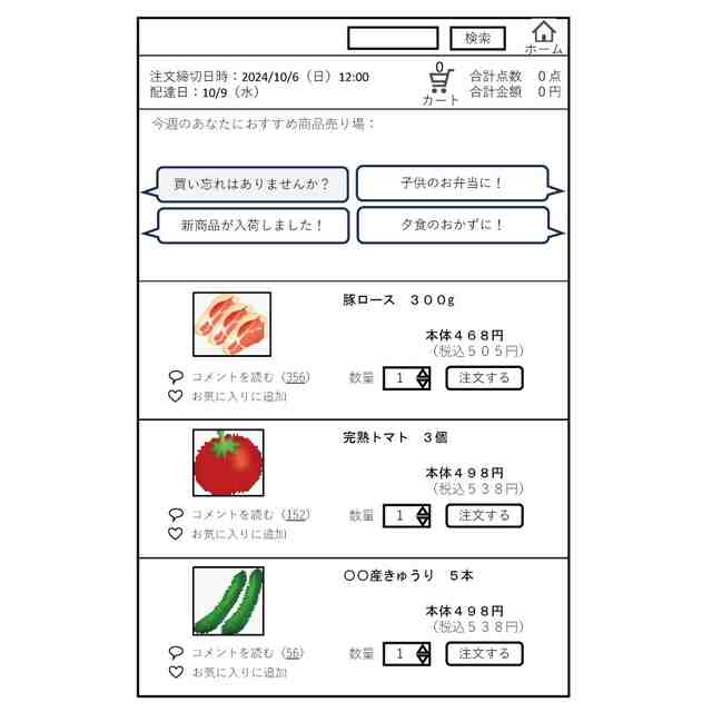 この意匠に係る画像は、情報表示端末に表示される画像であって、ECサイトにおける商品情報表示用画像である。「画像図」に示すように、吹き出し部には、複数の異なる切り口からなる、商品提案に関するレコメンド文が各々表示される。ユーザが吹き出し部領域内をタップ等により選択操作を行うと、商品情報表示部には、AI(レコメンドエンジン)により当該ユーザの顧客情報、嗜好及び商品購入履歴等に基づいて、レコメンド文に応じた商品が抽出され、レコメンド商品(お勧め商品)として表示される。例えば「使用状態を示す参考図1」に示されるように、ユーザが「買い忘れはありませんか?」の吹き出し部を選択操作すると、商品情報表示部には、AIにより当該ユーザの商品購入履歴等に基づいてパーソナライズされたレコメンド商品が表示される。「使用状態を示す参考図1」及び「使用状態を示す参考図2」はひと続きの画像であり、表示される複数のレコメンド商品が1画面内に収まらない場合、ユーザは画面を上下方向へスクロール可能である。 また例えば「使用状態を示す参考図3」に示されるように、ユーザが「子供のお弁当に!」の吹き出し部領域を選択操作すると、商品情報表示部には、AIにより当該ユーザの顧客情報(家族構成情報等)に基づいてパーソナライズされたレコメンド商品が表示される。ユーザはレコメンド商品の中から購入したい商品を発見した場合、当該商品をカートに入れることができる。