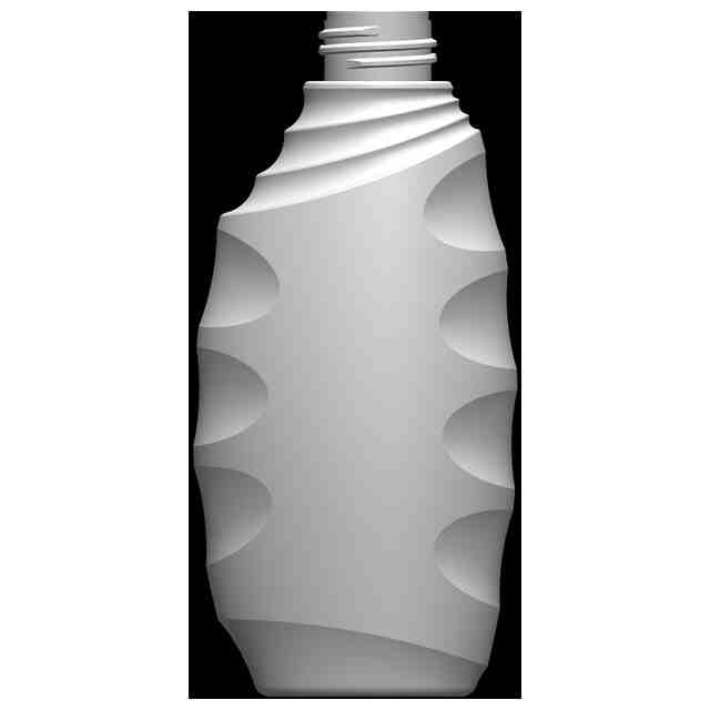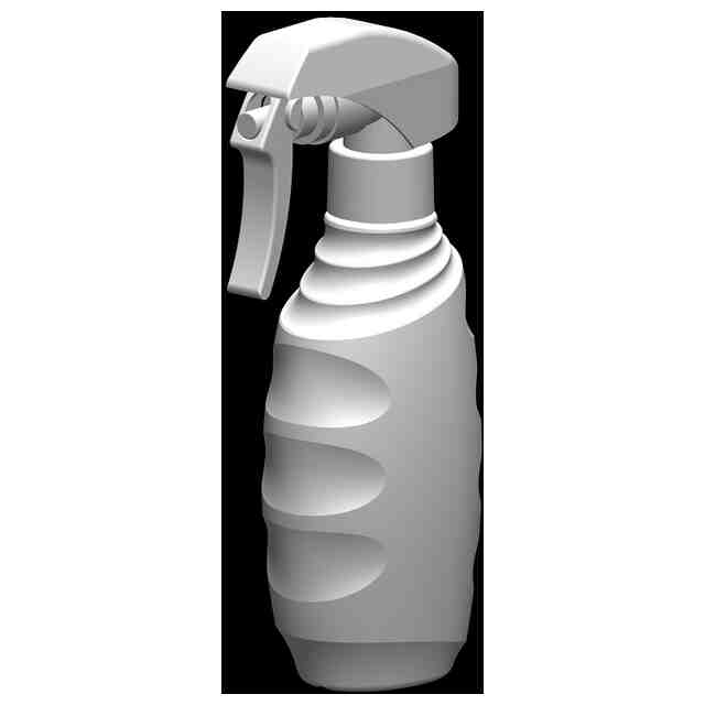 各図面はCGにより作成した図面であり、各図面の表面部全面に表された濃淡は、立体表面の形状を表す濃淡である。 液体を噴出するための噴出器を装着した状態を、使用状態を示す参考図として図示する。正面図には三箇所の窪みが、背面図には四箇所の窪みが設けられ、手が滑りにくい形状となっている。