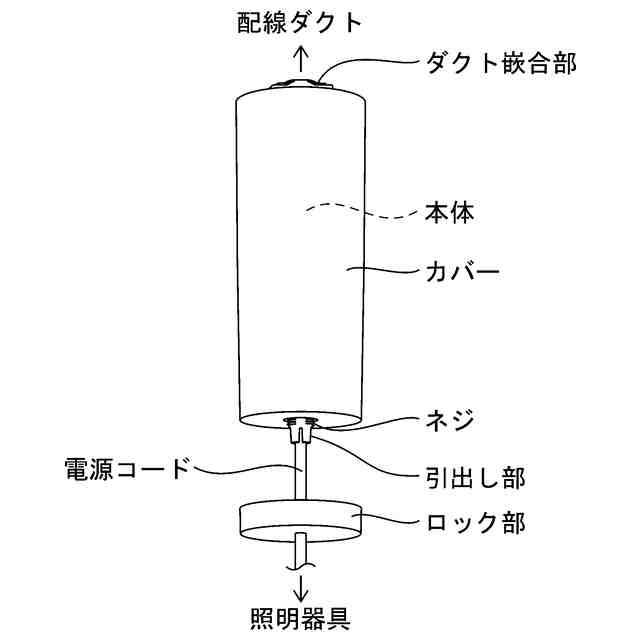 本物品は、例えば、天井吊下げ灯等の照明器具を、配線ダクトに取付ける配線ダクト用プラグである。本物品は、本体、本体を覆うカバー、およびロック部を備える。電源コードを収容した状態の参考分解斜視図に示すように、本体は、カバーから下方向に露出し、電源コードが引出される引出し部を備える。ロック部および引出し部は、ネジ等によって着脱可能に連結される。これにより、ロック部を介して、カバーを本体に固定するとともに、引出し部をロック部内に収容することができる。
