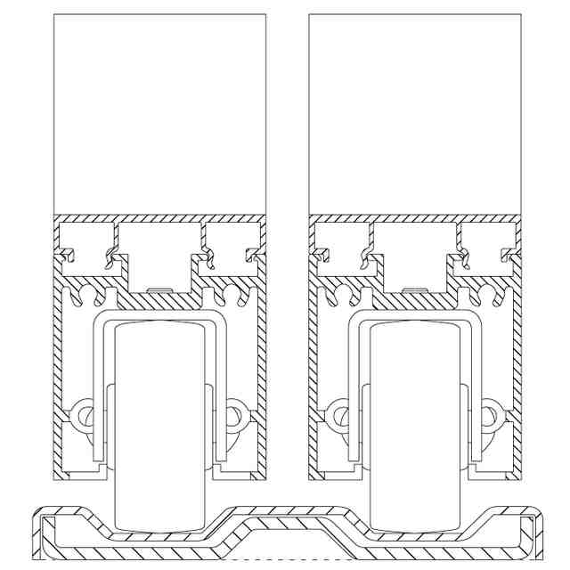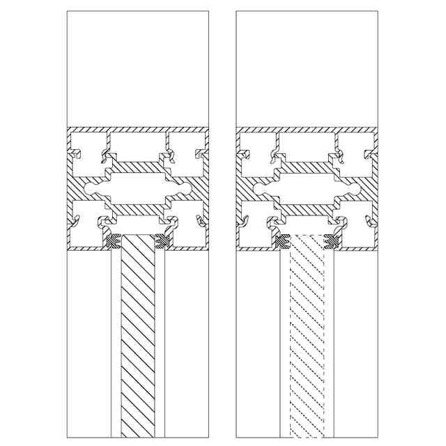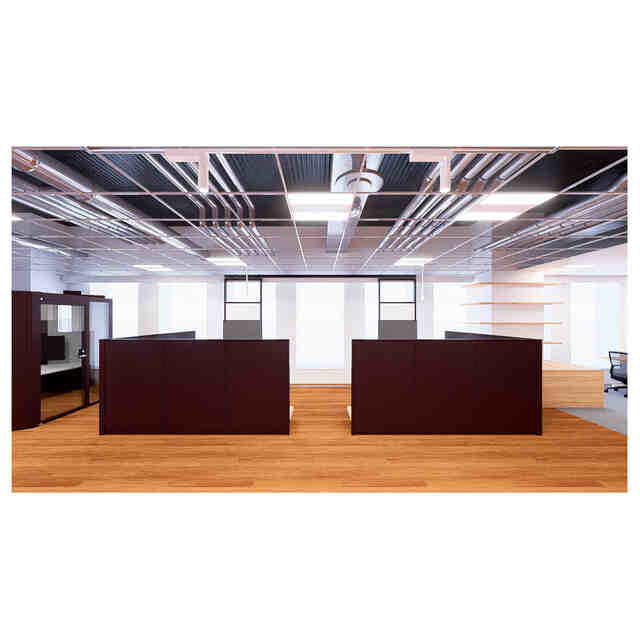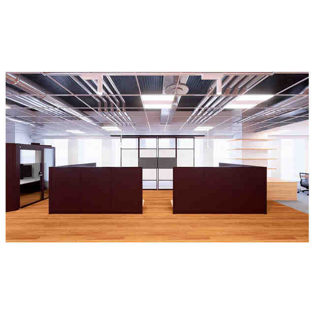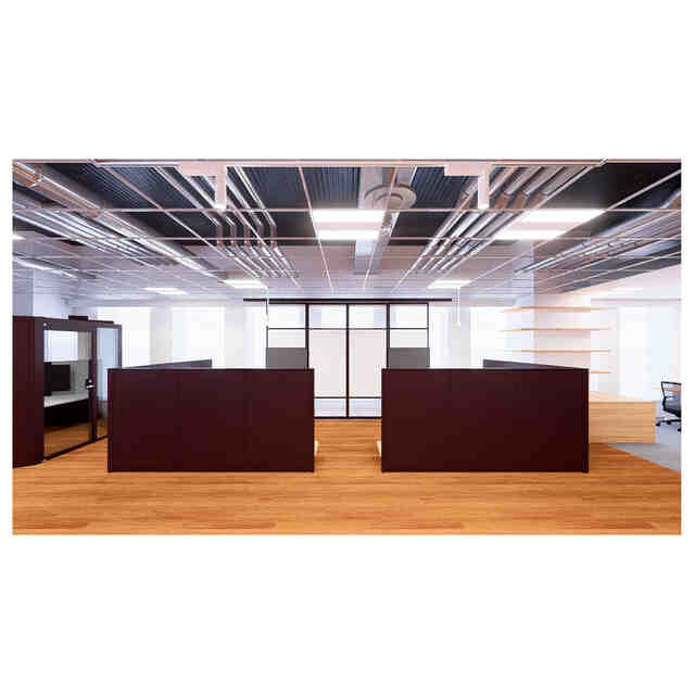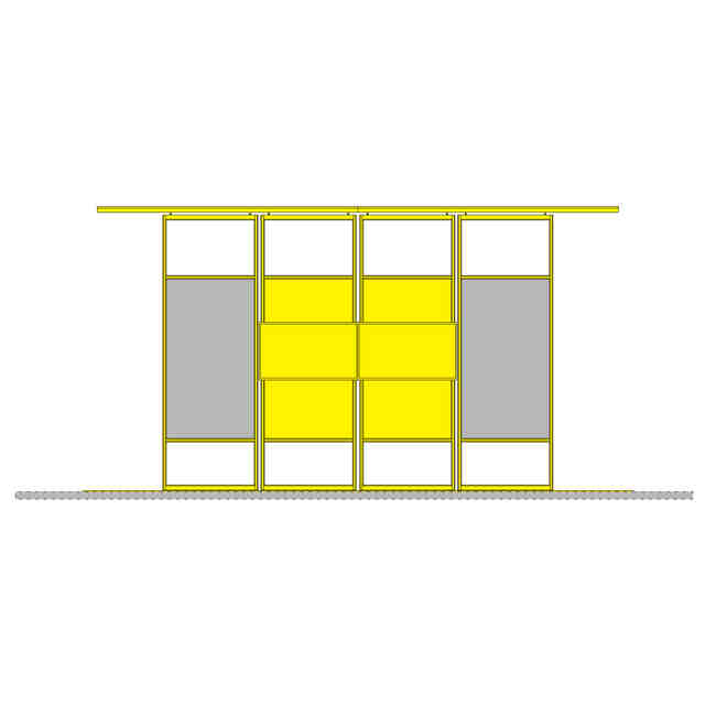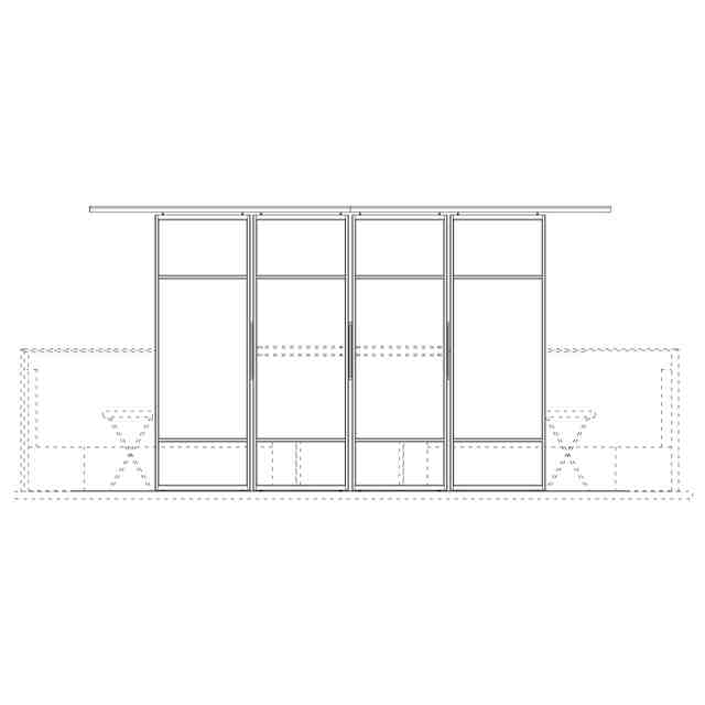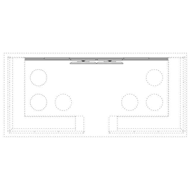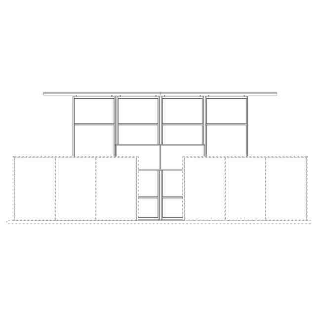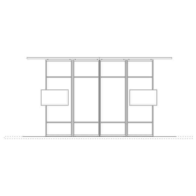 この内装は、オフィス空間を仕切るとともに、必要に応じてモニターの位置を調節することができるオフィスの内装である。2本のレールに沿って間仕切りが移動自在に取り付けられており、「ソファー及びテーブルを除いた変化した状態の正面図1」、「ソファー及びテーブルを除いた変化した状態の正面図2」に示すように、モニターの位置を調節したり、「ソファー及びテーブルを除いた変化した状態の正面図3」のように開口部を広げたりすることができる。間仕切りに取り付けられたモニターは、「ソファー及びテーブルを除いた変化した状態の正面図1」に示すように左右位置をスライドして調節することができる。