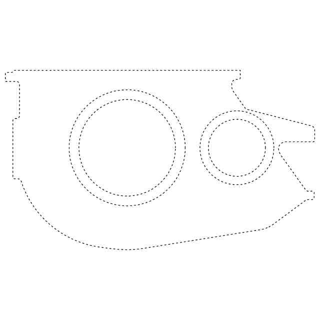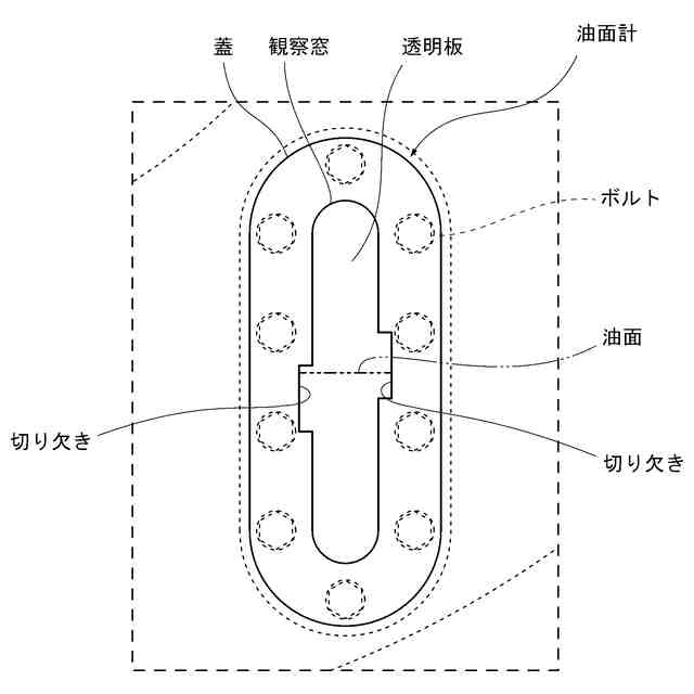 本物品は、鉄道車両に搭載され、主電動機から動力が伝達される小歯車と、車軸が圧入され小歯車と噛み合う大歯車と、を収容する歯車箱であり、内部に貯留される潤滑油を適正な油量で管理するために油面の高さを観察できる油面計を備える。「使用状態を示す参考正面部分拡大図」を参照して、油面計は、歯車箱の正面に形成された開口を塞ぐ透明板と、その透明板を覆う蓋とから構成され、蓋は、ボルトで歯車箱に固定される。蓋は、水平線に対して垂直な方向(鉛直方向)に延在する細長い形状の観察窓を有する。観察窓の両側縁の一部に切り欠きが設けられ、各切り欠きの上端と下端が、油面(図中の二点鎖線)の高さの管理指標となる目盛に相当する。