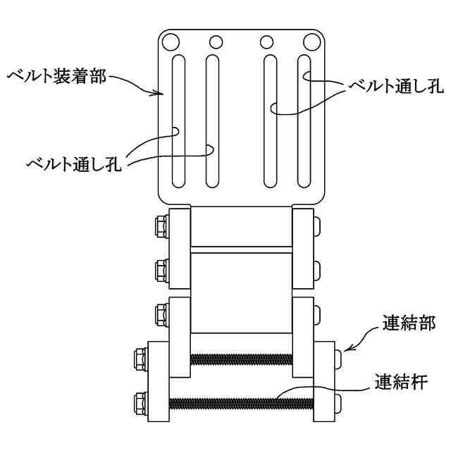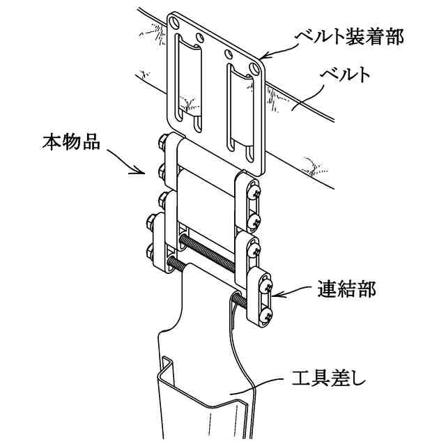 本物品は、参考正面図及び使用状態を示す参考図に図示したように、ベルト通し孔を設けたベルト装着部と、工具差し等を吊り下げ連結する連結杆を設けた連結部とからなる腰ベルト用金具である。本物品の高さは、約20cmであり、ベルト装着部の幅は、約8cmである。本物品は、アルミ製である。