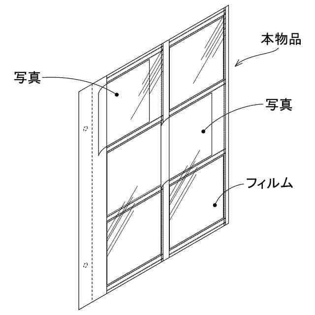 本物品は、台紙と、台紙を挟むように透明のフィルムとを備え、表裏に12の写真差込部を形成した、正方形の写真を収納する写真整理用台紙である。
