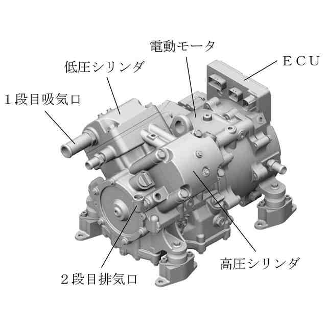本物品は、車両等に搭載され、圧縮した空気を空気ブレーキ等の空圧機械に供給する空気圧縮機である。本物品は、1段目吸気口から吸入した空気に低圧シリンダにおいて第1段目の圧縮を行い、この圧縮空気を1段目排気口から配管に吐出し、この圧縮空気を配管内で冷却部により冷却した後に2段目吸気口から高圧シリンダに導入し、この高圧シリンダにおいて第2段目の圧縮を行い、この高圧シリンダで圧縮された空気を2段目排気口から空圧機械に供給するものである。