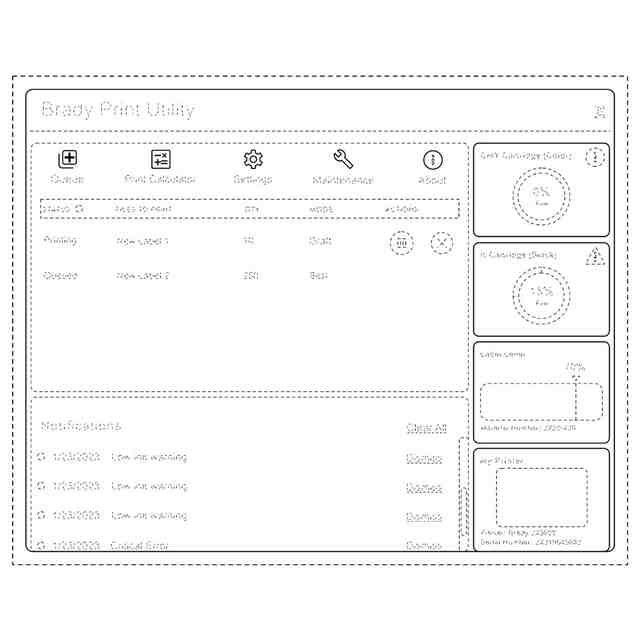 本画像は、ラベルプリンター等のプリンターに接続された表示画面に表示され、例えば、プリンターの印刷状況、プリンターの他の作動モード、プリンターからの通知、カラーカートリッジの残量、ラベルの残量、プリンター名が表示され、印刷の一時停止や中止を行うことができる。