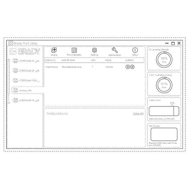 本画像は、ラベルプリンター等のプリンターに接続された表示画面に表示され、例えば、プリンターの印刷状況、プリンターの他の作動モード、プリンターからの通知、カラーカートリッジの残量、ラベルの残量、プリンター名が表示され、例えば、プリンターの選択、印刷の一時停止や中止を行うことができる。