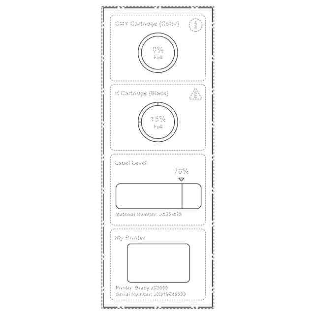 本画像は、ラベルプリンター等のプリンターに接続された表示画面に表示され、例えば、カラーカートリッジの残量、ラベルの残量、プリンター名が表示される。