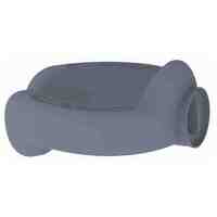本物品は、内部に粒子状の充填材(例えば発泡ビーズ)が封入されることにより変形可能な本体を有する枕(半身枕)である。本物品は、参考図1に示されるように、使用者が本物品上に仰向けに寝ることで、粒子状の充填材の流動性により、お尻下部の圧力を受けた充填材が乗った人の外形に沿って移動し、使用者を柔らかく包み込むように保持する形状を備えている。加えて、本物品は、参考図2に示されるように、使用者が本物品上に横向けに寝ても、使用者を柔らかく包み込むように保持する形状を備えている。お尻下部に存在する充填材は、本物品上で寝返りを打った際、ボールベアリングのような転動体の役割を果たすことで、寝返りを容易に行い得る。そのため寝返りを打つことが困難な人が、同じ姿勢をとることで接触面に生じる褥瘡を予防できる。加えて、要介護者の体位変換に必要な介護者の力を低減できるため、介護者の腰痛の発生を抑制できる。本物品は、平面図、斜視図及び参考図3に示すように、頭側の外形が緩やかな曲面を形成した形状を有している。この形状を有していることで、内部の充填材がほぼ均一な力で頭を含む上半身を柔らかく包み込むことが可能となっている。緩やかな曲面を形成していない場合、包み込む圧力が均一とはならないので、軟らかさに欠けることになる。本物品は、平面図、A-A断面端面図及びB-B断面端面図に示すように、平面図の中央部に充填材が流動可能な連通部が設けられている。この連通部を介して、変化した状態の斜視図1及び参考図4に示すように、頭側に充填材を移動させたり、変化した状態の斜視図2及び参考図5に示すように、お尻側に充填材を移動させたりすることができる。充填材の移動により、使用者の好みに応じて枕の高さを変形させることができる。本物品では、参考図1に示されているように、使用者の体全体の重心(身体重心)が位置するお尻下部で底付きし、一方、肩から頭にかけて及び太ももの下部には充填材が存在することで、上がった状態となる。この状態では、腰が適度に曲がった姿勢となる。この姿勢は、胎児姿勢(膝を軽く胸に引き寄せ、背中を少しだけ丸めた姿勢)に近く、癒し付与性の向上及び睡眠の質の向上により有効であると考えられる。胎児姿勢をとることで赤ちゃんが泣き止むように、大人になっても体や心の緊張がほぐれ、安心させる効果を本物品は有している。また、この姿勢は、無重力状態での宇宙飛行士が最も負担のかからない姿勢である中立姿勢に相当するともいえる。即ち、無重力状態では、背中がやや曲がり、太ももが上がった姿勢となり、筋肉の緊張や背骨にかかる負担が最小限になることが知られている。この中立姿勢を本物品は取ることができる。本物品は、参考図6に示すように、カバーを装着することも可能である。図中、点線は、縫い目を意味する参考線である。