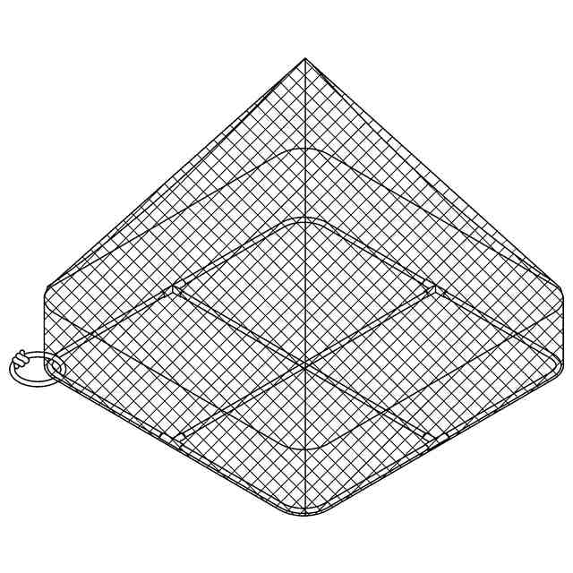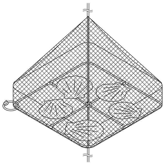 本物品は、ホタテ貝等の貝類の養殖に用いられる吊り輪付き養殖籠である。全体の形状は略四角錐形状であり、四角錐の4つの稜線のうち貝出入口が設けられた稜線に対応する底面の角部とは対角に位置する角部に、吊り輪を有する。この吊り輪をフック等に掛けて養殖籠を保持したり、吊り輪を持って養殖籠を持ち上げたりすることができる。吊り輪は、「吊り輪の結び方を示す参考図」において(1)から(4)に示される順で作製することができる。