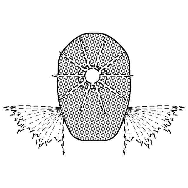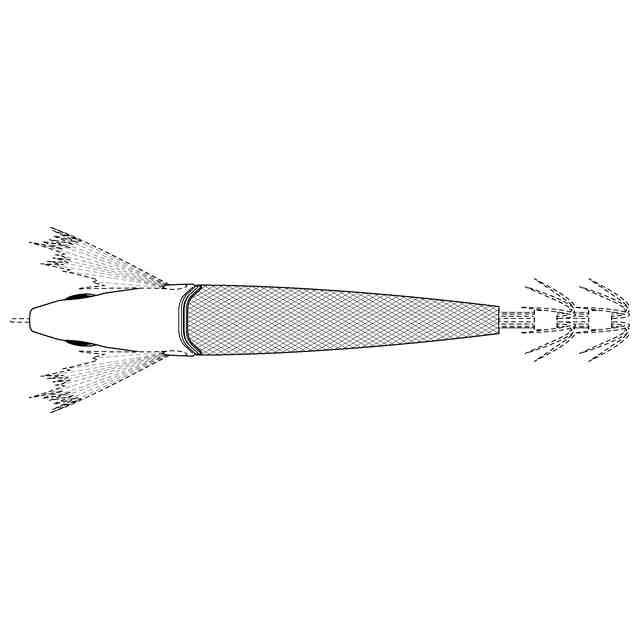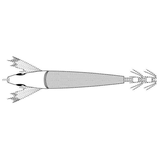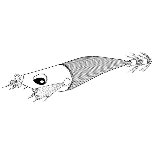 図中に実線で表された部分が意匠登録を受けようとする部分である。陰影を付加して示した参考斜視図、陰影を付加して示した参考正面図は、イカ釣用擬餌表面の凹凸を明瞭にするために陰影を追加して表わした図であって、物品の表面に現される濃淡は、表面の色彩のトーンを現したものではない。色彩を施した状態を示す参考図1~9は、物品表面に色彩を施したものを示したものである。また擬餌の本体部に表現された網目状パターンは、表面に設けられた布、布地を模した樹脂製シートを簡略的に示したものである。