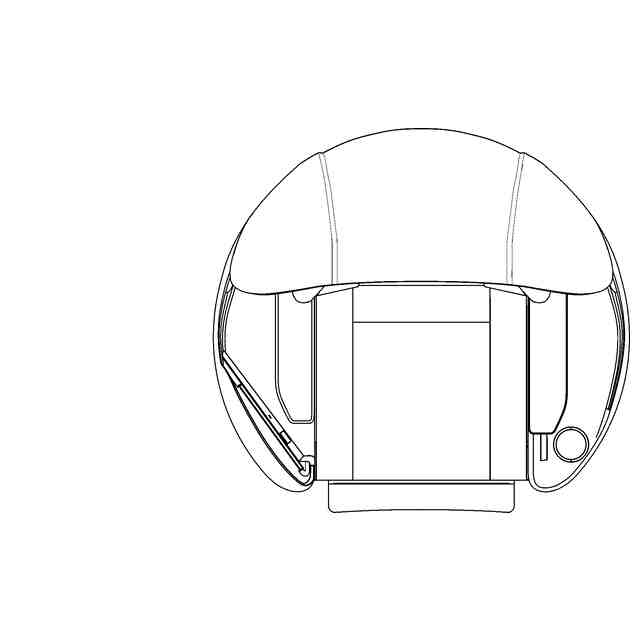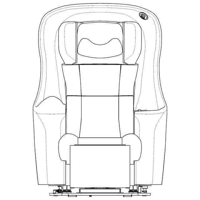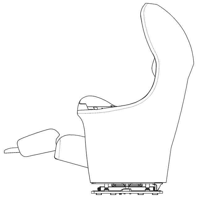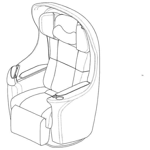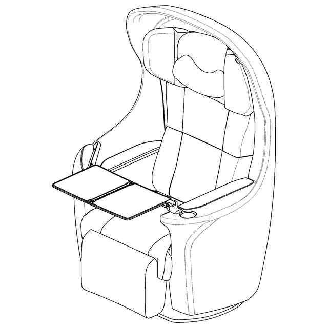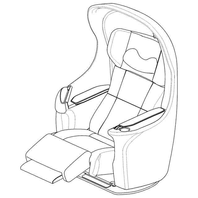 本物品は、鉄道車両等の乗物に設置される1人掛けの乗物用座席である。この乗物用座席は、座部の後端側に背凭れがリクライニング角度を調整可能に支持され、背凭れと座部は連動してリクライニング状態となる。座部と背凭れの背面側はインナーシェルで囲まれ、インナーシェルの外側に座席背面の全体を大型のバックシェルが一体に連続して設けられている。バックシェルの外形は平面視で円筒形状とし、バックシェルの背面下部を前方に向かって傾斜させた掘込み形状としている。バックシェルの前端開口の片側上部に読書灯が設けられている。インナーシェルないしバックシェルで座席側方を覆う箇所には、左右一対のアームレストに相当する部位が一体形成され、当該部位上に肘当てが設けられている。片側の肘当て下方にはインアームテーブルが収納されている。インアームテーブルは折畳み式であり、肘当てを開けて取り出し左右に展開することが可能である。座部の前端側下方には、レッグレストが起倒可能に設けられ、レッグレストには、足置きが伸縮可能に設けられている。