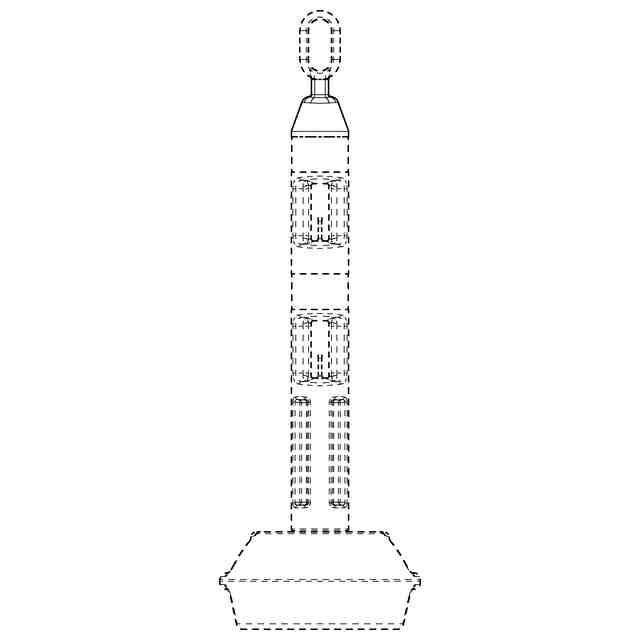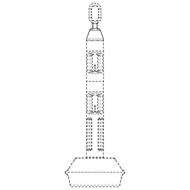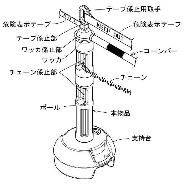 本物品は、参考斜視図に示すように、チェーンやバー、危険表示テープ等をかけ渡して進入禁止等を表示するためのチェーンスタンドである。本物品は、参考斜視図に示すように、直立棒状のポールと、ポールを着脱可能に支持する支持台とを備える。ポールは、上端から順に、リング状のテープ係止用把手と角柱状のテープ係止部、コーンバーのワッカを係止する円錐台状のワッカ係止部、上下2つのチェーン係止部を備えている。支持台は、内部に水を貯留することで重量を確保する。