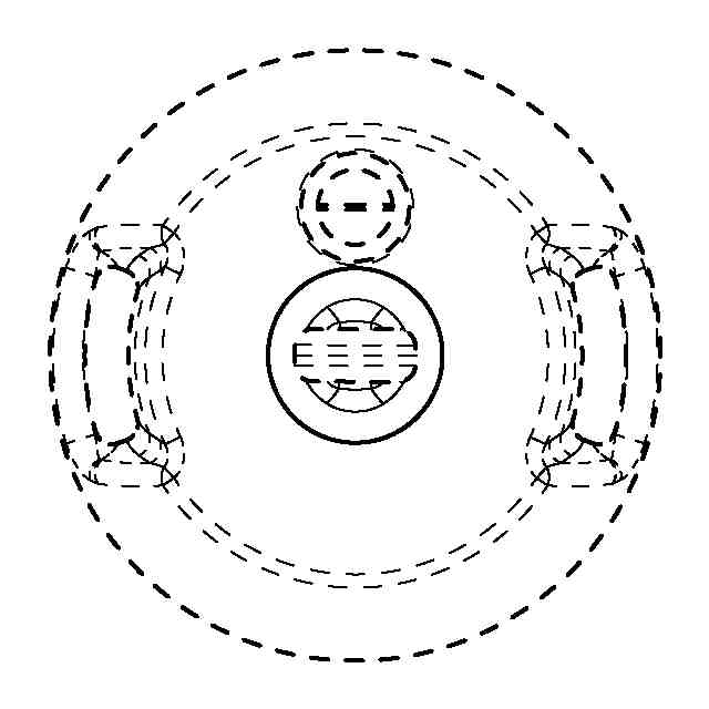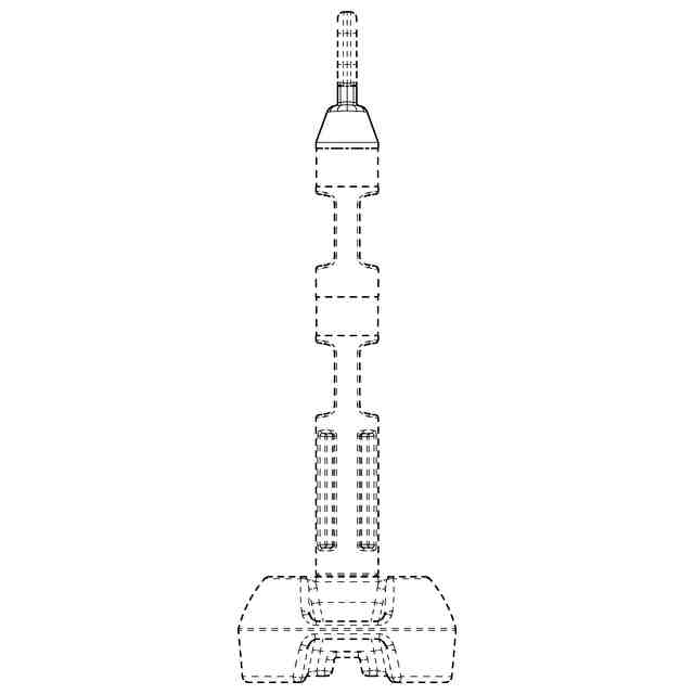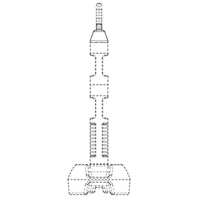 参考図以外の各図において破線で示した部分以外の部分が登録を受けようとする部分である。一点鎖線は、登録を受けようとする範囲のみを示すためのものである。細線は、平面と曲面及び曲面同士の境界を示し、立体表面の形状を特定するためのものである。参考斜視図に示すように、テープ係止用把手は中央に水平方向の貫通孔を有し、チェーン係止部は、水平方向の貫通孔の中央に立設された棒状の立柱からなる。