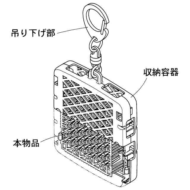 本物品は、樹脂に防虫用薬剤を練り込ませて成形したものであり、使用状態を示す参考図に示すように、本物品を通気孔を有する収納容器に収納し、各所に吊るして使用する。