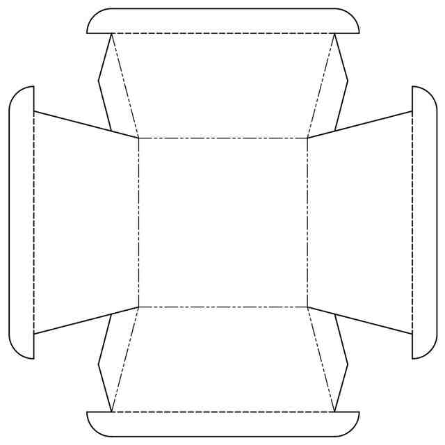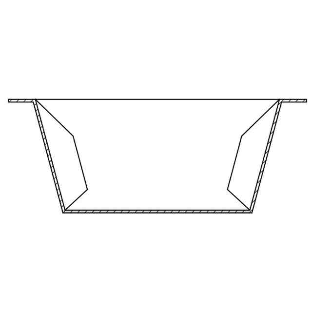 この物品は、参考展開図に示す例えば紙製のシート状のブランクがプレス機によって成形されることによって形成される包装用容器である。参考展開図に示したブランクが破線において山折りで、二点鎖線において谷折りで折り曲げられつつ、ブランクが成形時に押圧されて包装用容器としての形状が形成される。また、包装用容器の縁部でブランクが重なる部分は、C-C部分拡大左側面図に示すように、成形時に押圧されることによってブランクの板厚が低減しており、正面図、左側面図、A-A線断面図及びB-B線断面図に示すように、縁部上面は全周において段差がなく同一面内に納まるように平滑かつ水平に形成されている。これにより、包装用容器の縁部上面を用いて密閉性の高いトップシールが可能になり、例えば食品保存期間を延長させたり、液体の漏れが防止される。さらに、包装用容器の縁部上面、内側面及び底面において、合成樹脂製シートが貼着されてもよく、これにより、包装用容器としての形状が保持され、液体の漏れが防止される。合成樹脂製シートは、加熱軟化された後、圧空成形又は真空成形によって包装用容器に密着される。合成樹脂製シートは、酸素や水蒸気等に対する遮断性を有する場合、食品の長期保存が可能になる。合成樹脂製シートが包装用容器から剥がしやすく貼着される場合、紙製の包装用容器と合成樹脂製シートを分別して廃棄可能である。