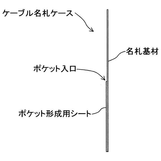 本物品は、各種ケーブルに名付け等をする際に使用されるケーブル名札ケースである。本物品は、所望の番号や記号、文字等を記載した名札シートをポケット内に収納して使用される。「各部の名称を示す参考図」や「各部の名称を示す参考右側面図」に示すように、本物品は、名札基材の下部にポケット形成用シートが貼着されており、名札基材の下部とポケット形成用シートとの間で、名札シートを収納可能なポケットが形成されている。このポケットは、上方にポケット入口を有する。なお、ポケット形成用シートは、透明材料から形成されており、「名札シートをポケットに収納した状態の参考図」に示すように、名札シートに記載されている番号や記号、文字等を外部から視認可能に構成される。また、名札シートがポケット内に収納された本物品は、「ポケット形成部分を差込孔に通した状態の参考図」や「ポケット形成部分を差込孔に通した状態の参考右側面図」に示すように、ケーブルに巻く形態でポケット形成部分を差込孔に差し込んで通してケーブルに取り付ける。本物品は、ポケット入口に重なる位置に、名札基台及びポケット形成用シートを共に貫通する貫通孔が形成されているため、ポケット入口部分を、「効果を説明する参考図」に示すように、名札基台とポケット形成用シートとを共に左右方向から押し込むことで、ポケット入口が開きやすくなり、ポケット内に名札シートが収納しやすくなる。また、例えば、貫通孔を介して、手指や棒状体を用いて名札シートを動かすことかできる。